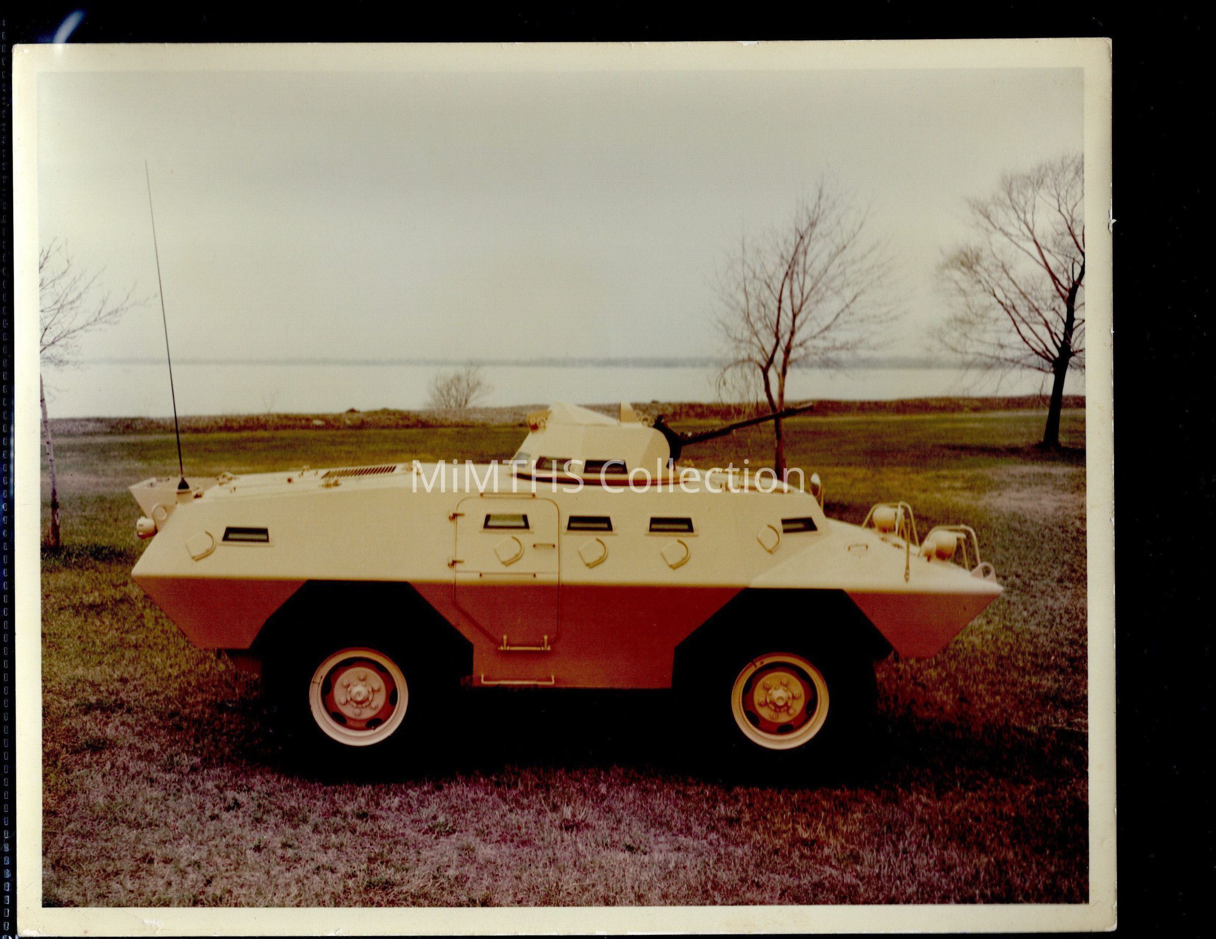 A side angle view of a Cadillac Gage v100 commando in desert tan paint.Photograph Details