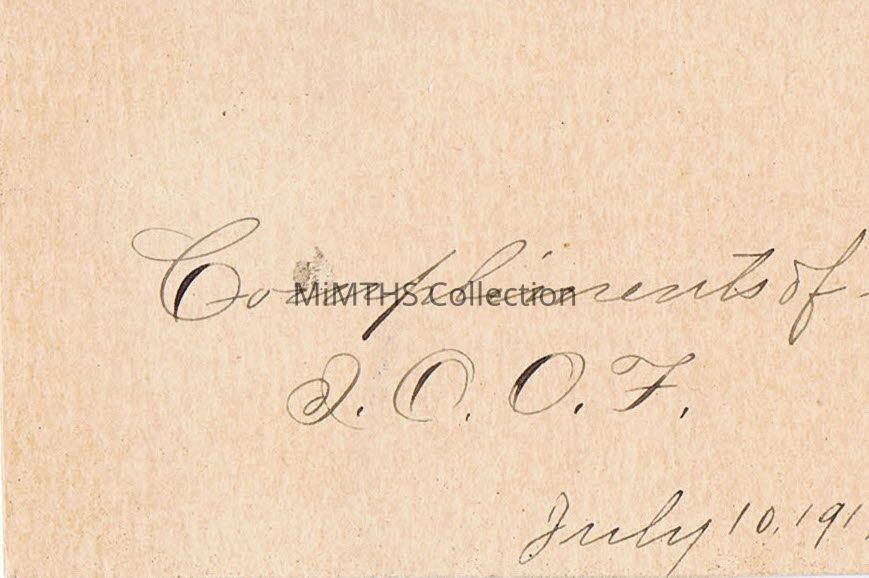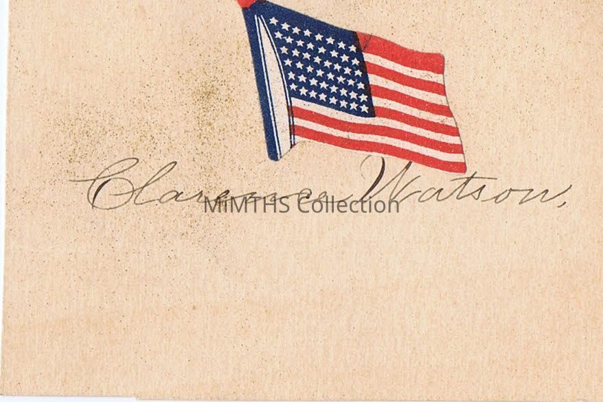 2"x3" card wirh American flag printedin color with Clarance Watson's name written in pencil. On reverse, written in very nice hand, "Compliments of I.O.O.F. July 10, 1917."Cataloged By