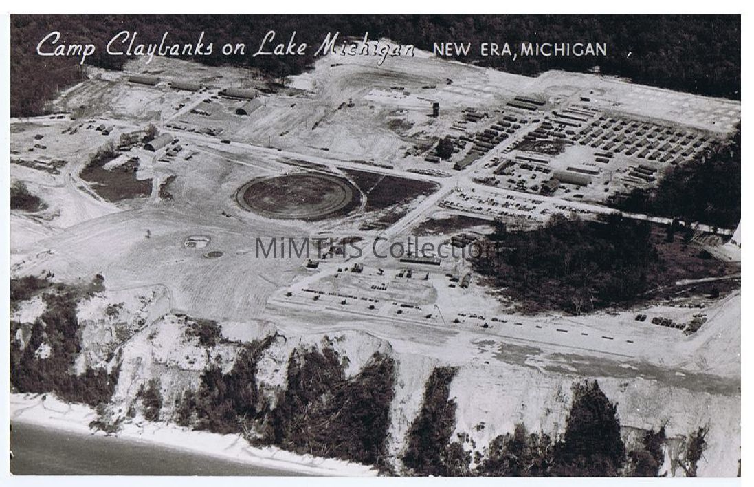 An unused, black and white post card displaying an areal view of Camp Claybanks, including barracks and the steep dunes of the shoreline. Across the top is written "Camp Claybanks on Lake Michigan New Era, Michigan." The camp operated from 1953 to 1958 and trained servicemembers in the use of anti-aircraft artillery.Cataloged By
