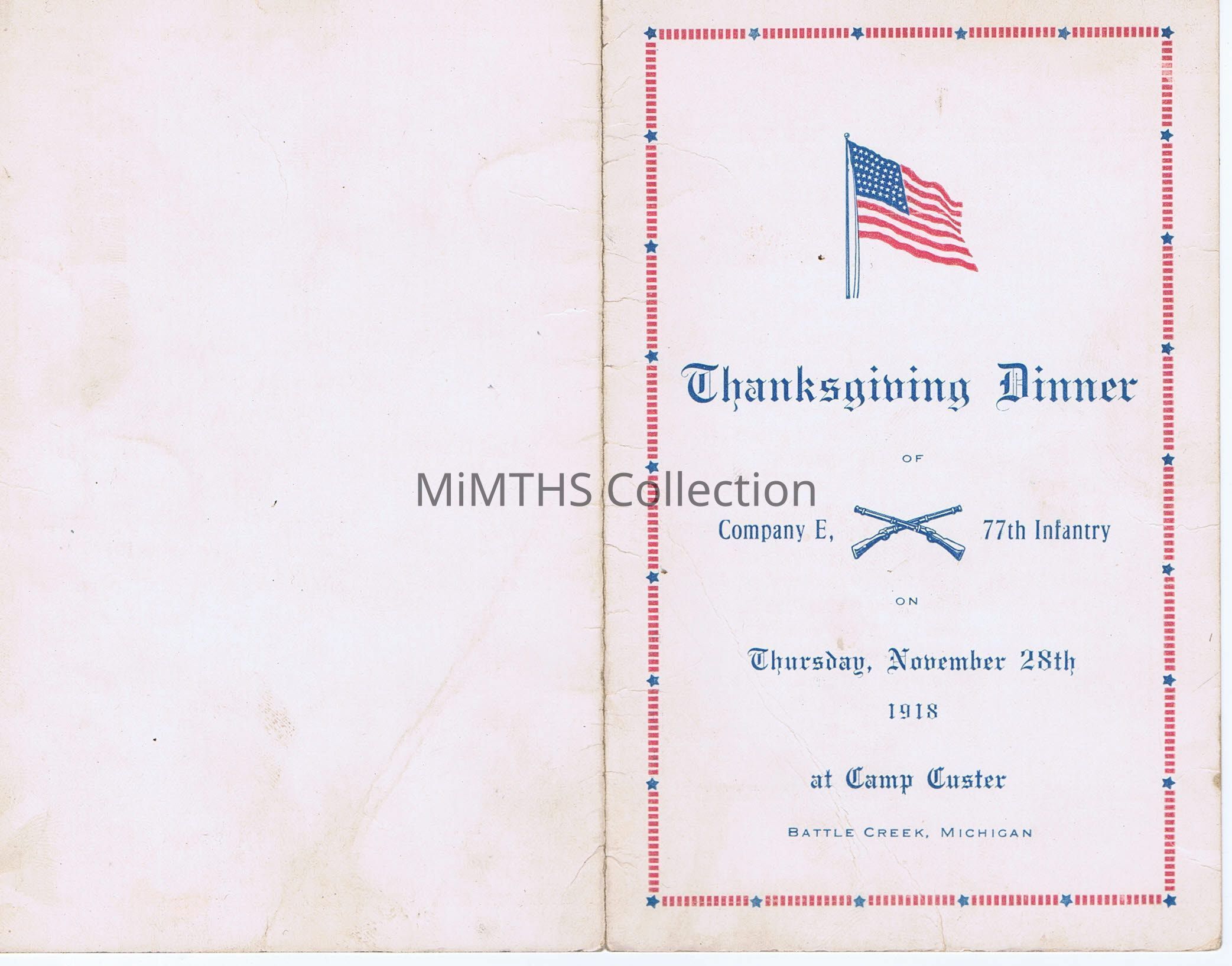 The folded menu from the Company E, 77th Infantry's Thanksgiving dinner at Camp Custer. List what was served and a thanksgiving prayer on the inside.Cataloged By