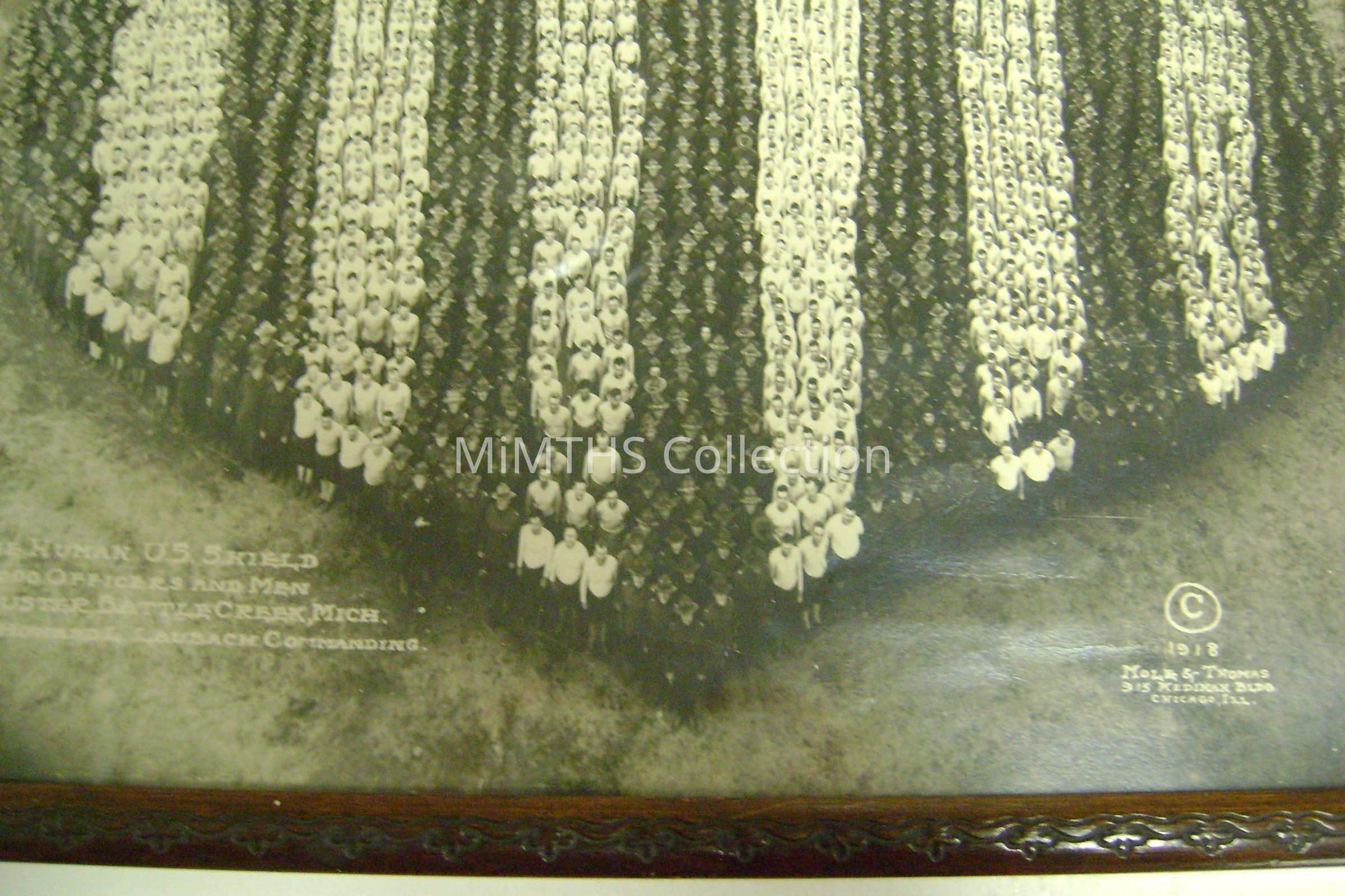 This is a photograph taken at camp custer of 30,000 military personnel posed in a way that looks to be the US shield. Taken in 1918 by photographers from Chicago.Photograph Details