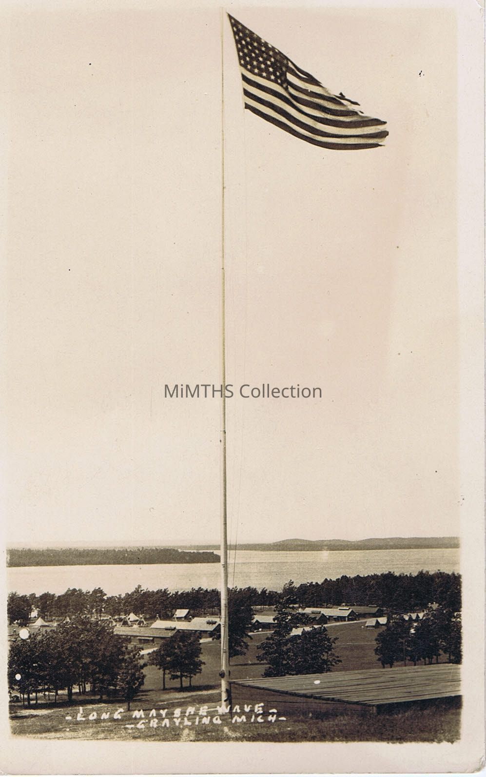 Postcard from 1930's Camp Grayling, flagpole "Long May She Wave"Cataloged By
