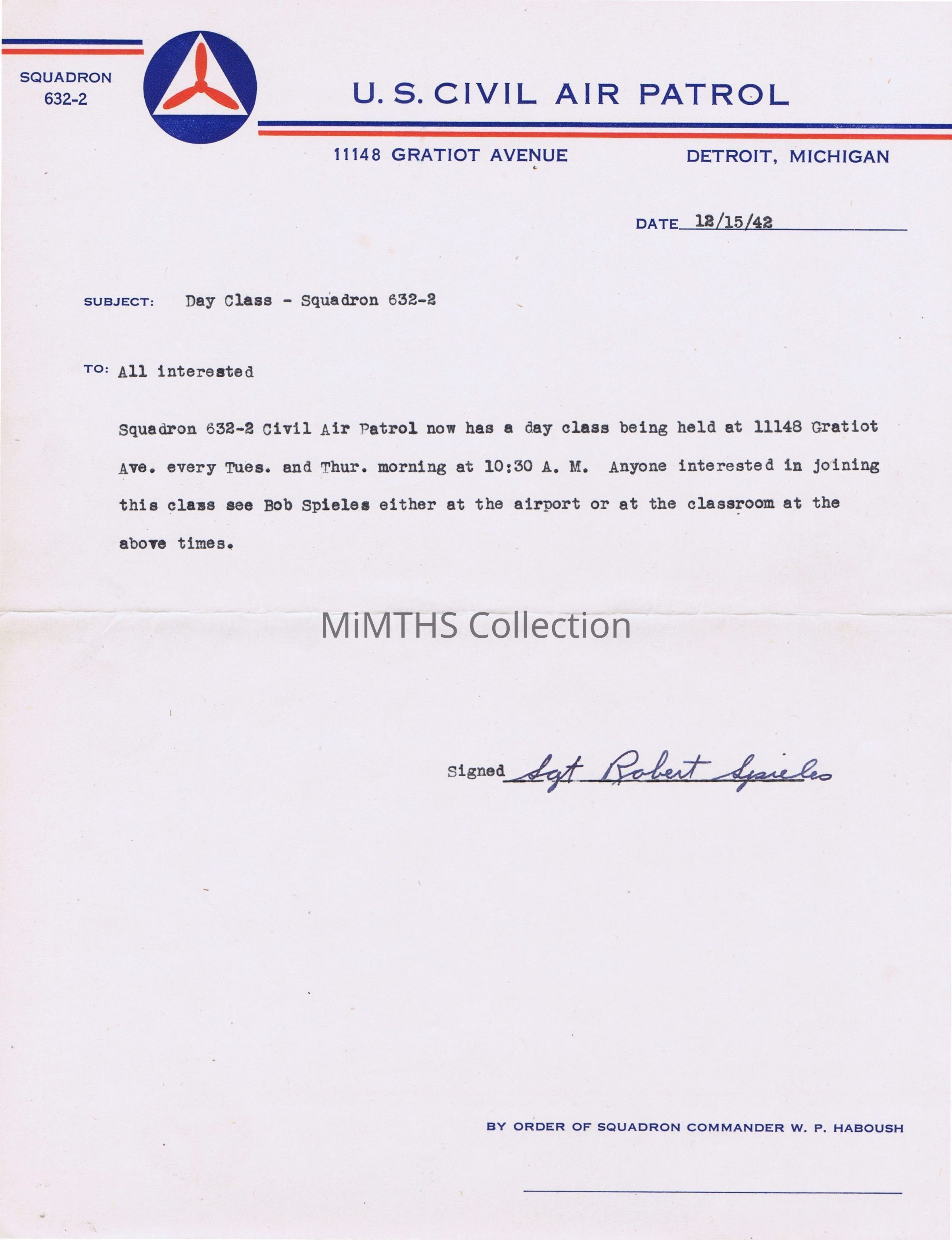 12/15/1942 dated announcement for day classes at Detroit City Airport, Civil Air Patrol Squadron 632-2Cataloged By