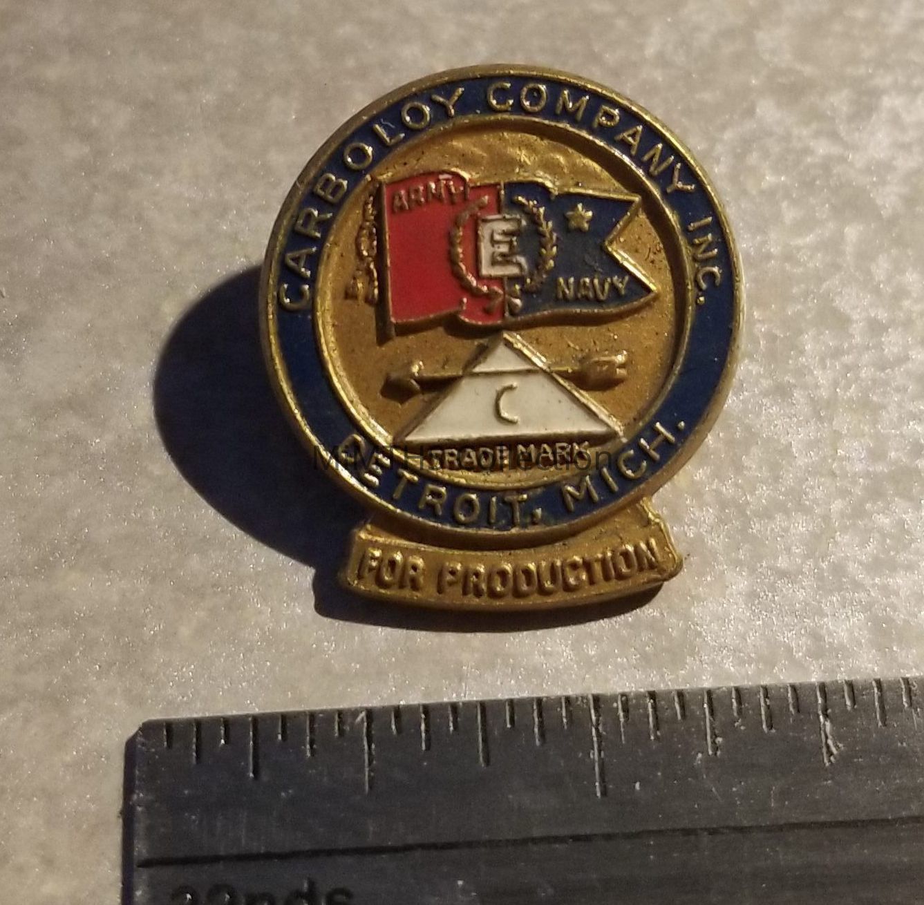 1/2 round pin from the Carboloy Company of Detroit with Army - Navy E-Award motif.