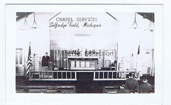 Small souvenir photo in black and white. Printed at the top: "Chapel Services Selfridge Field, Michigan" shows inside of chapel with American flag on far left, three men bottom right, and a preacher between the flag and alter. Same image as 2020.6.36Photograph Details
