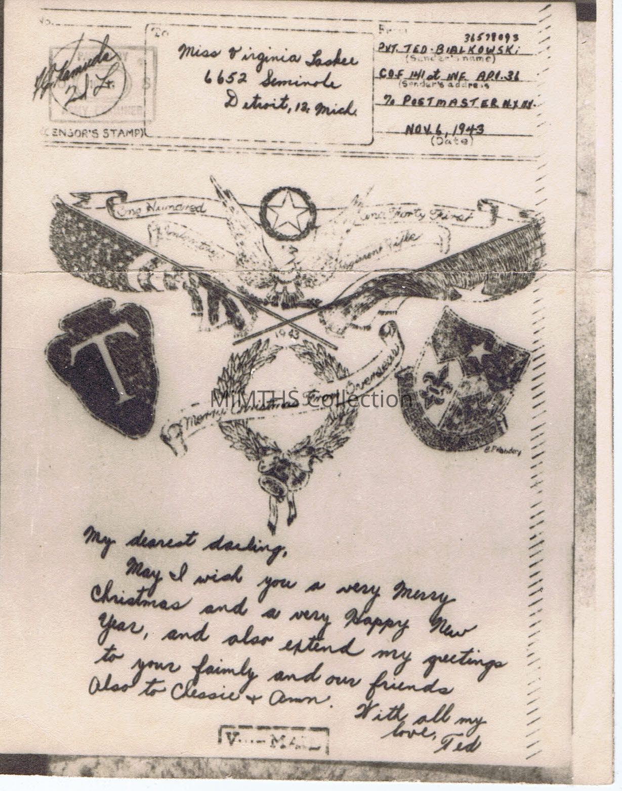1943 Christmas from overseas V-Mail from Ted Bialkowski to Virgina Laske of Detroit.Cataloged By