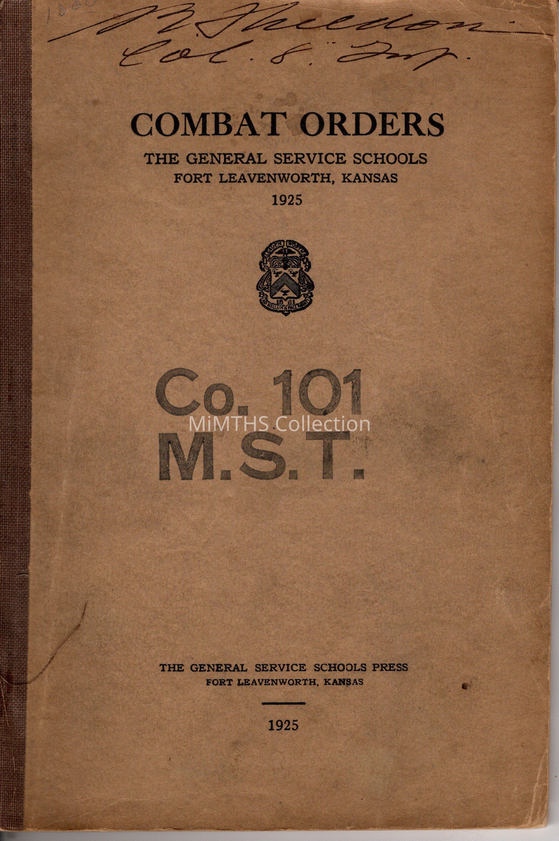 Combat Orders manual from the the General Service Schools, Fort Leavenworth, Kansas. property marked on front cover to Co. 101, M.S.T. - Michigan State Troops. Co 101 was located at the Piquette Armory in Detroit.Cataloged By
