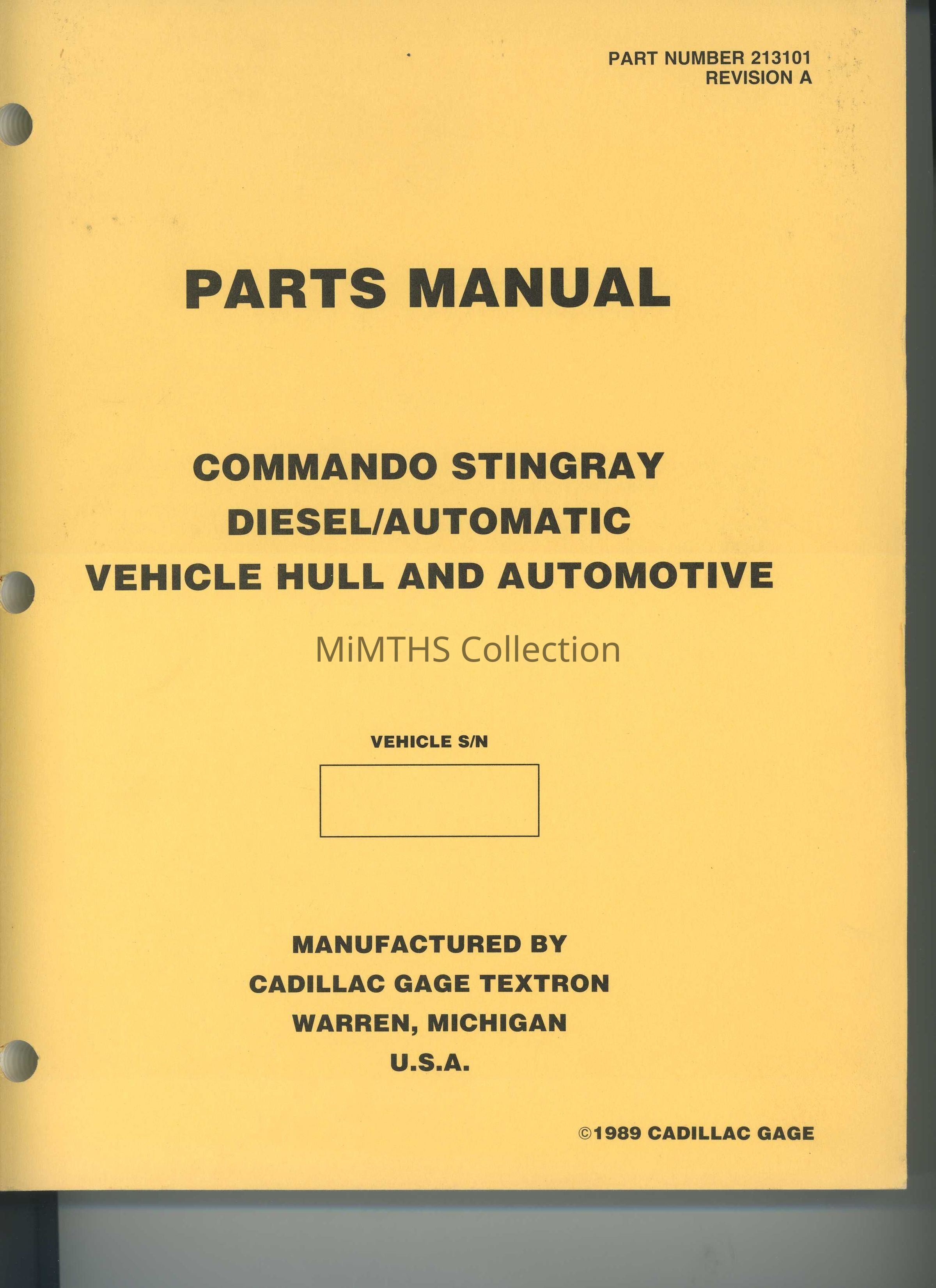 Manufactured by Cadillac Gage Textron Warren, MI . Parts Manual Part Number 213101 Revision A, Commando Stingray Diesel/ Automatic Vehicle Hull and Automotive Parts ManualCataloged By