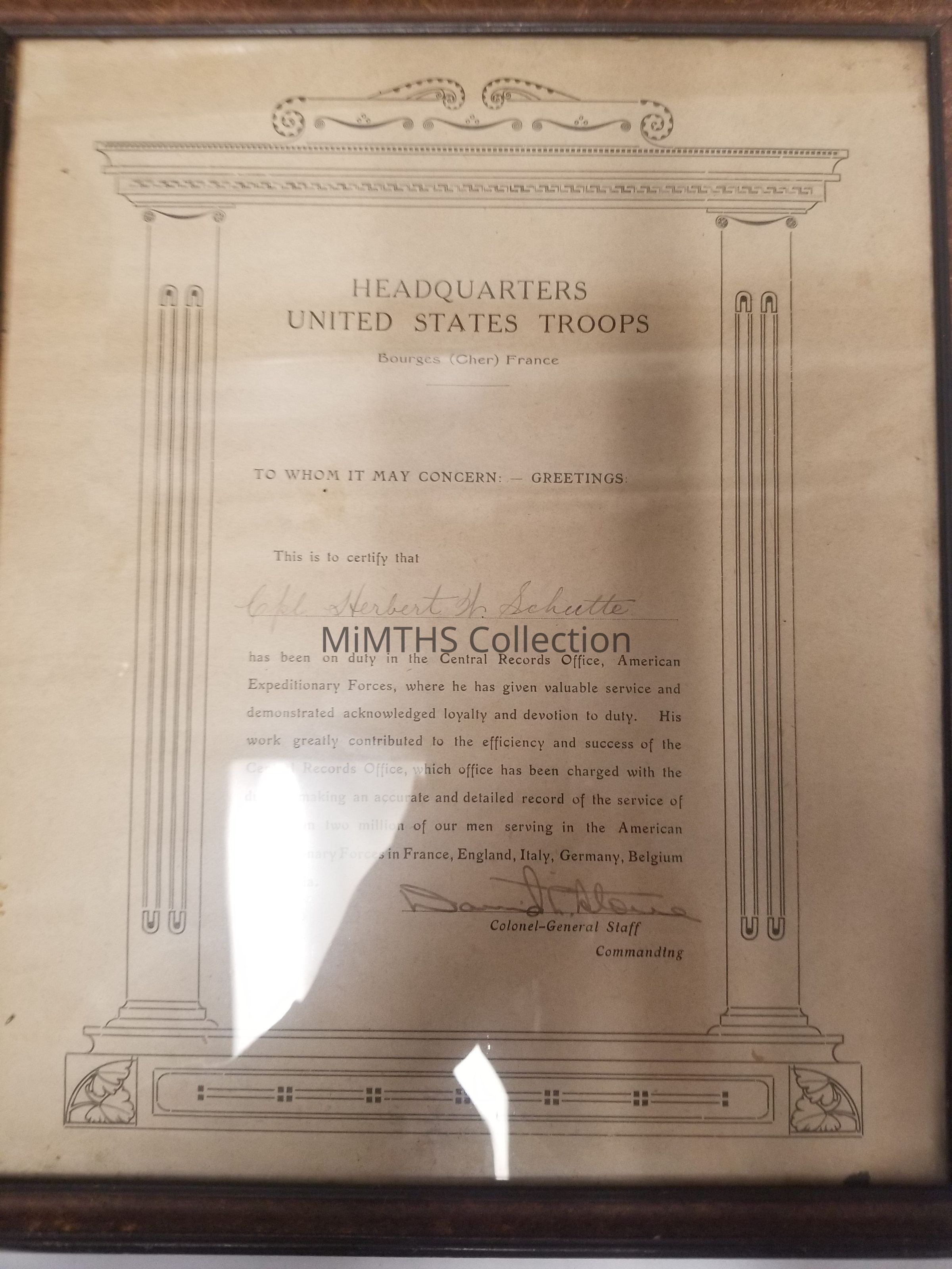 Certificate indicating that Corporal Herbert Schutte served with the Headquarters United States Troops, Central Records Office in France during WWI.