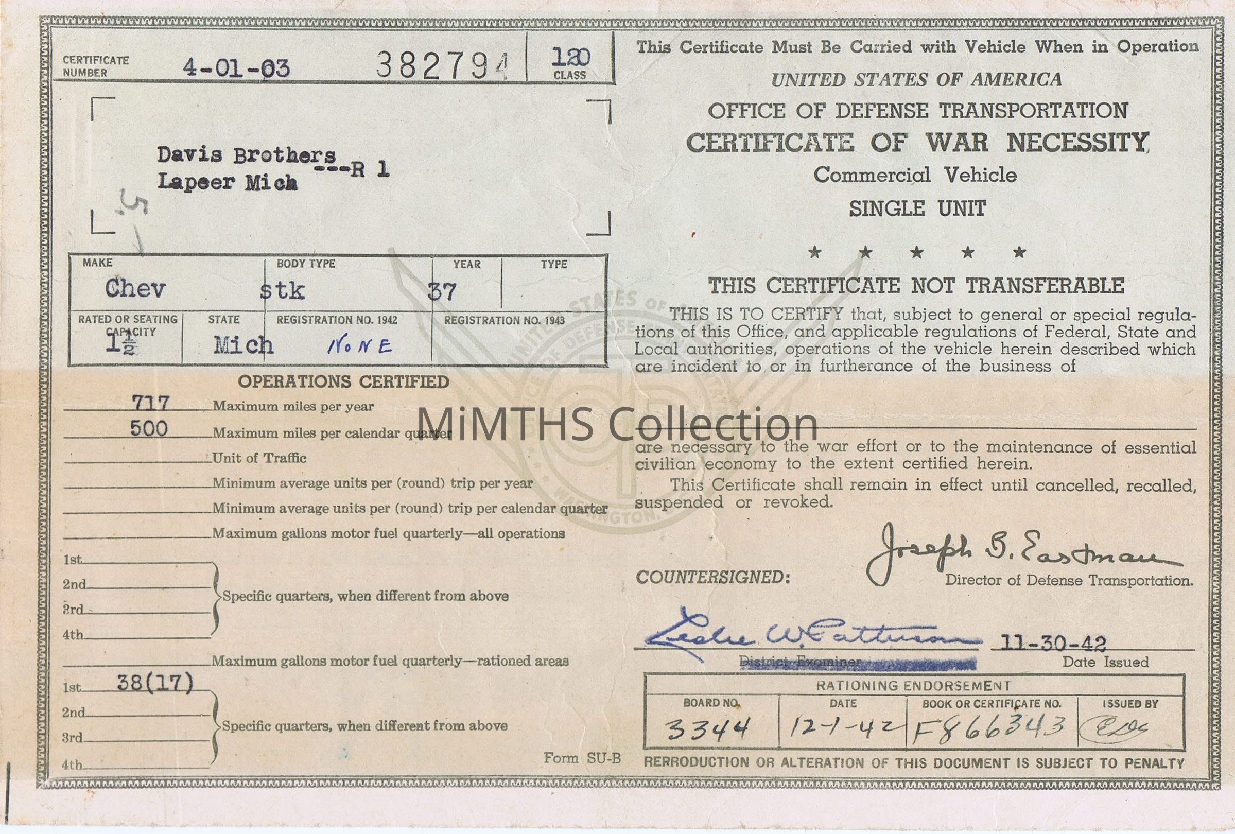 A Certificate of War Necessity (Form SU-B) authorizing the use of a 1937 Chevy Stake Truck from Lapeer, MI. The certificate was for Davis Brothers in Lapeer Michigan. There is a blank line for the filer to state for what business the vehicle is to be used. Per the 120 classification in the top middle, this vehicle may have been for farm work.
