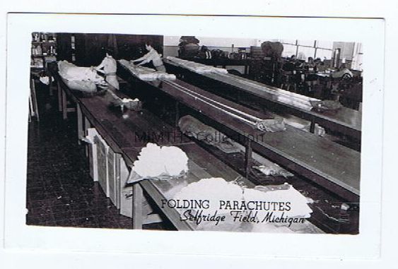 A small souvenir photo in black and white. Printed in bottom right "Folding Parachutes Selfridge Field, Michigan." Image shows two women folding parachutes. Same image as item 2020.6.25Photograph Details