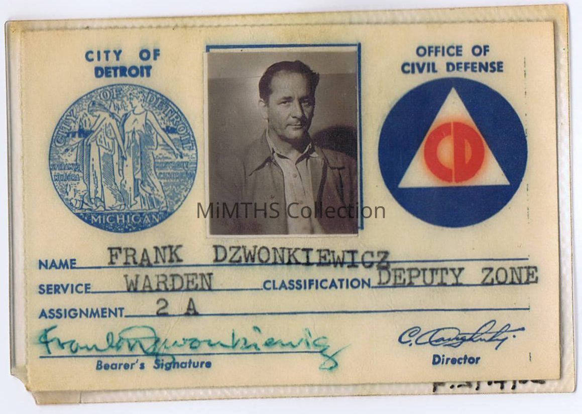 A 2.5x3.5 laminated card issued by the city of Detroit to Frank DzwonkiewiczCataloged By