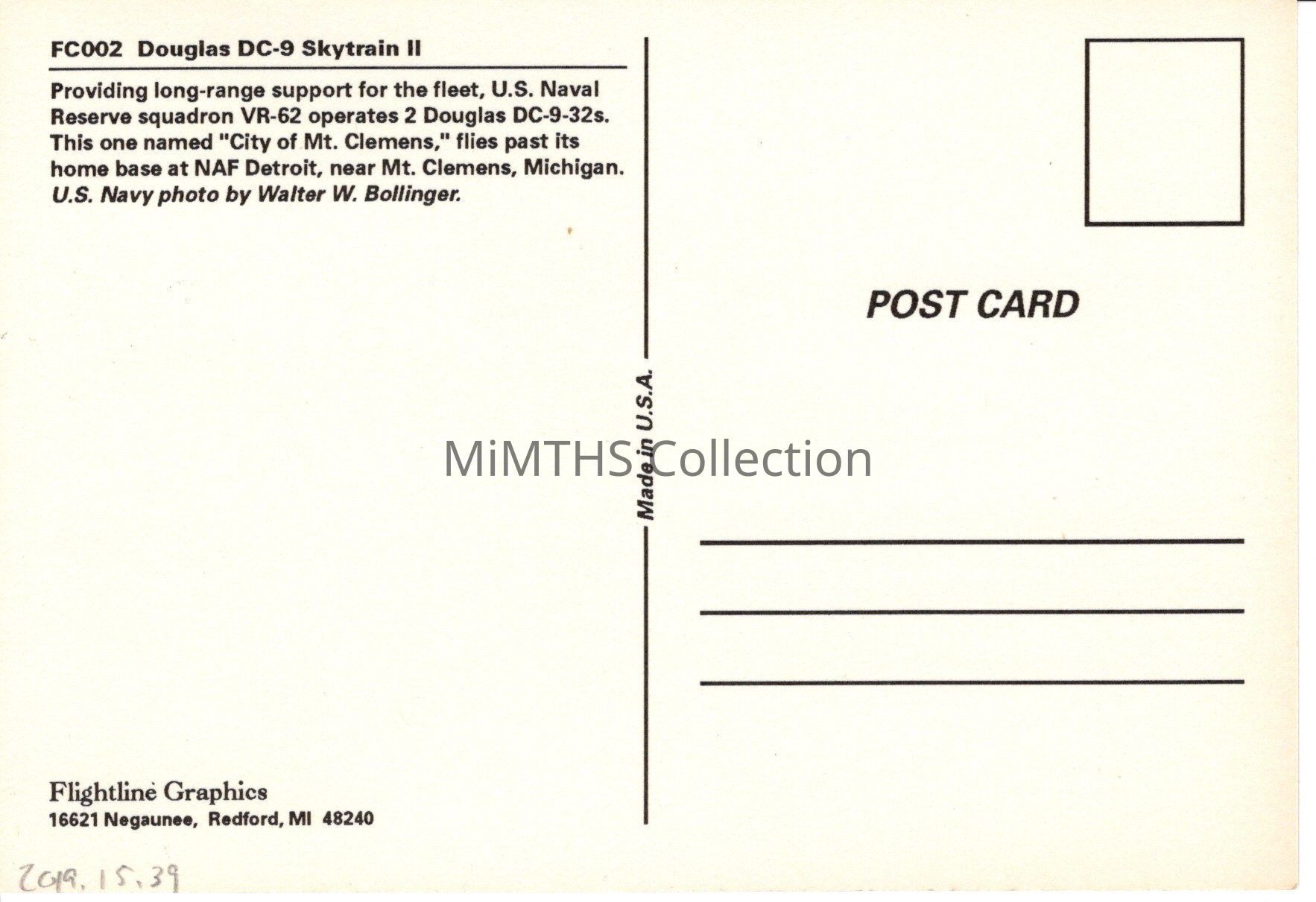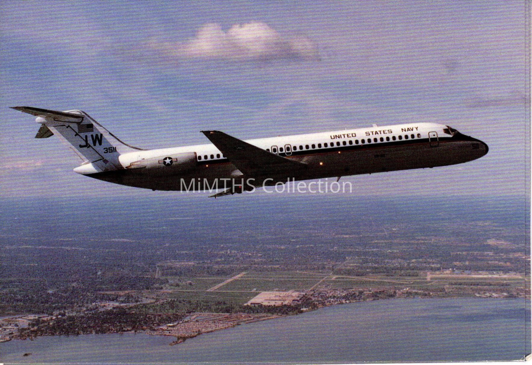 Postcard image of the Douglas DC-9-32 Skyytrain II "City of Mt. Clemens" flown by the US Naval Reserve Squadron VR-62 out of NAF Detroit (Selfridge ANGB)Cataloged By
