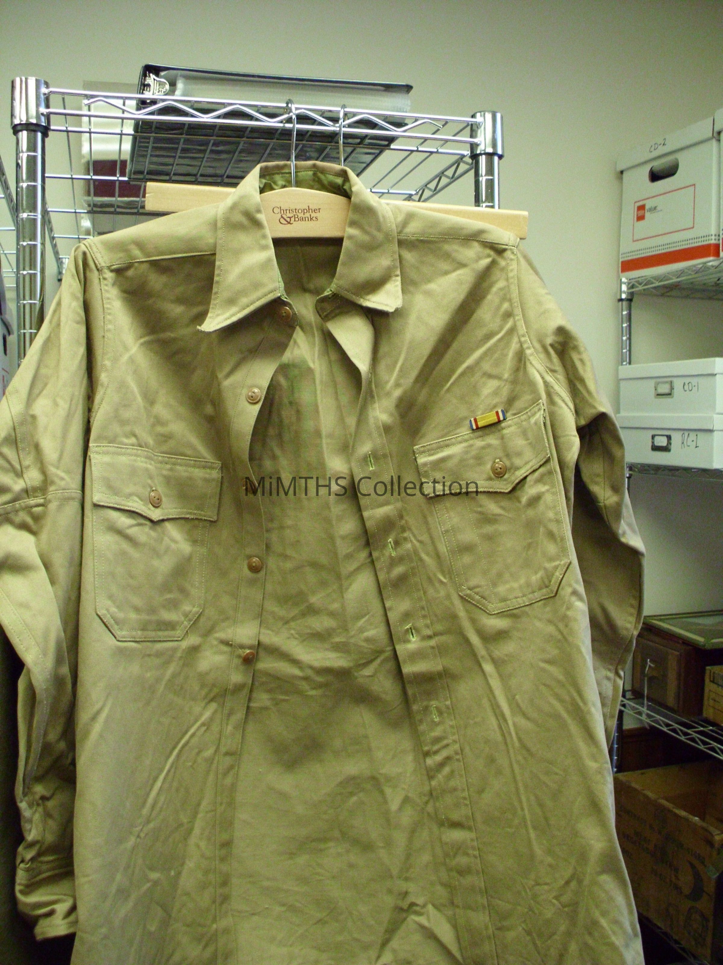 - Shirt, Men's Enlisted, Cotton Khaki shirt with MST shoulder patch and Post VJ-Day service ribbon.
