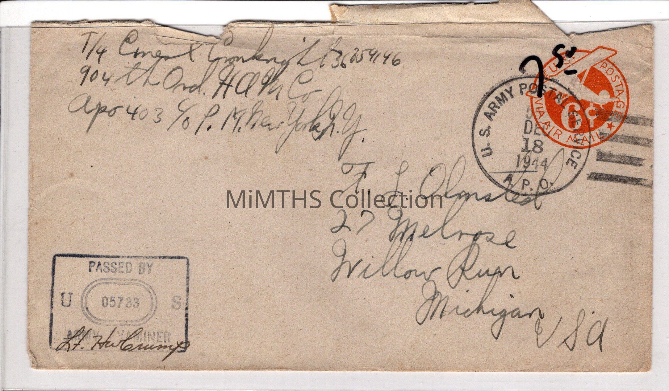 Envelope dated 12/18/1944 from T4 Earnest Conkling (?), 904 Ordnance Heavy Automotive Maintenance Company to T.J. Olmstead 27 Melrose, Willow Run, Michigan.