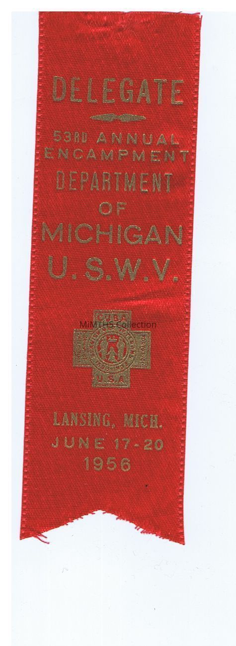 Delegate Ribbon,53rd Annual Encampment Department of Michigan USWV (Cuba) Lansing MI June 17-20 1956.