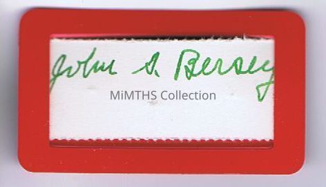 Has a Red, plastic nametag with "John S. Bersey" written in green pen on a slide in piece of paper.