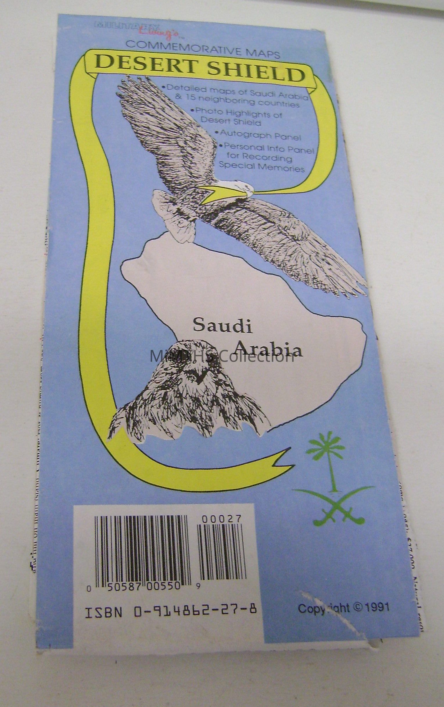 Desert Shield Souvenir map. This map was sold at an army exchange, it had an AFFES price sticker for $.97 on it, but the glue dried up and it fell off. The map has a space on back for an address so a deployed solder could mail it home.Cataloged By