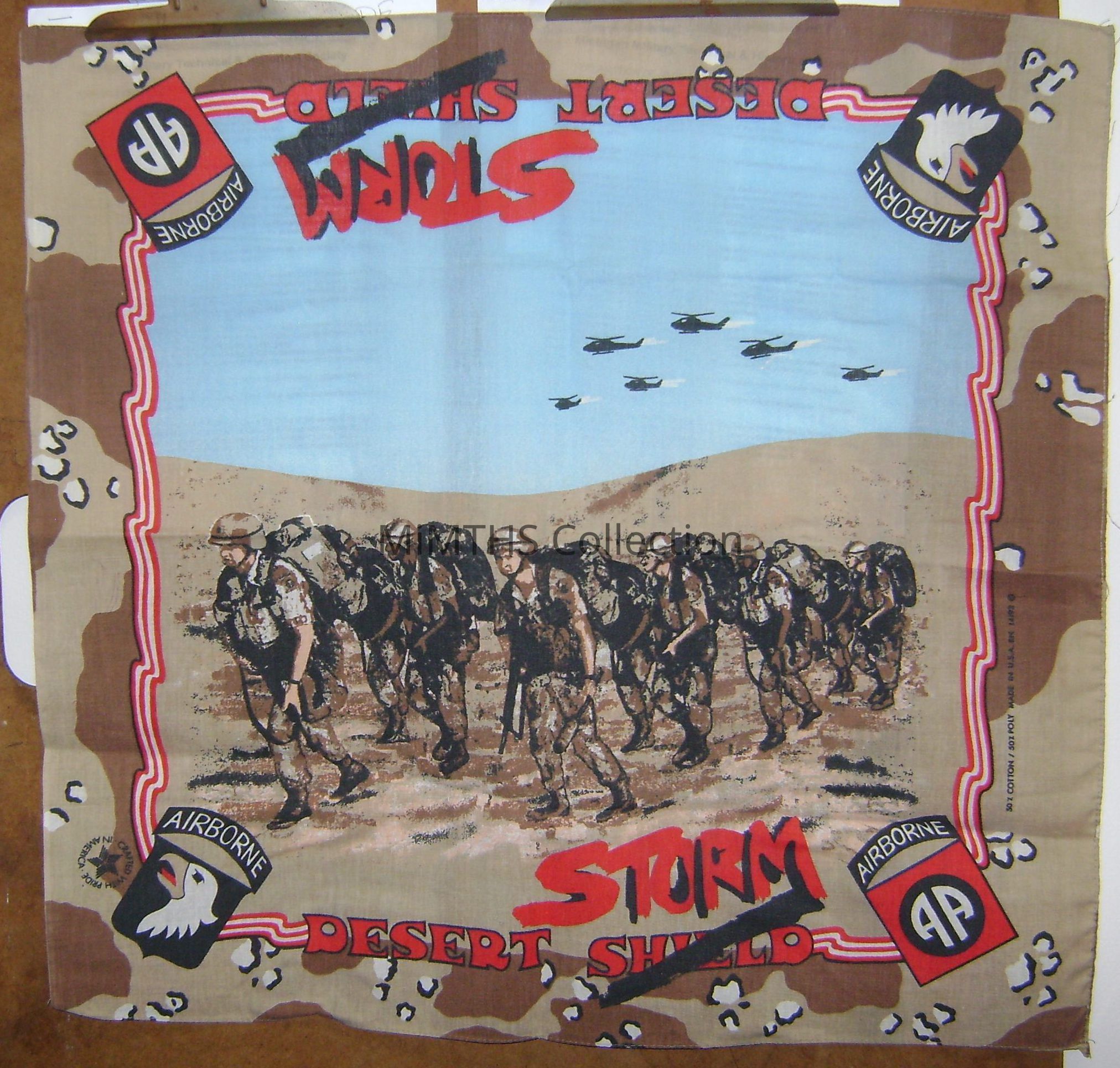 Approx 22x22" kerchief with 101st and 82nd Airborne insignia and "Desert Shield" with the "Shield" Crossed out and "Storm" added above in script.Cataloged By