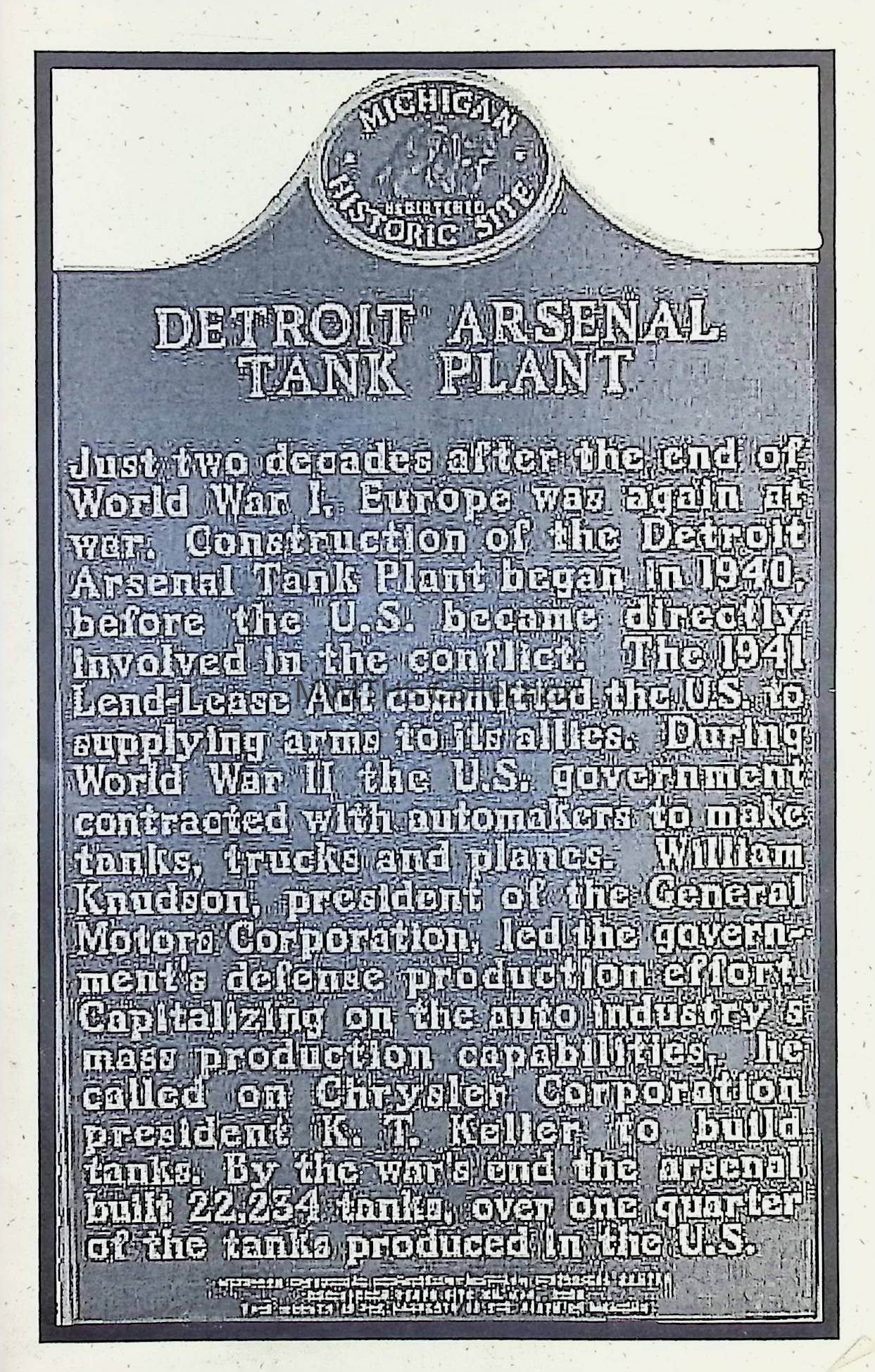 Detroit Arsenal Tank Plant Historical Marker ProgramEntry/Object ID