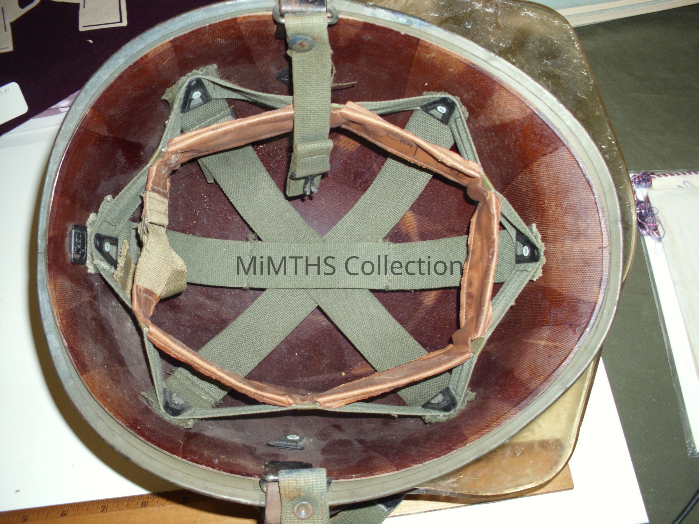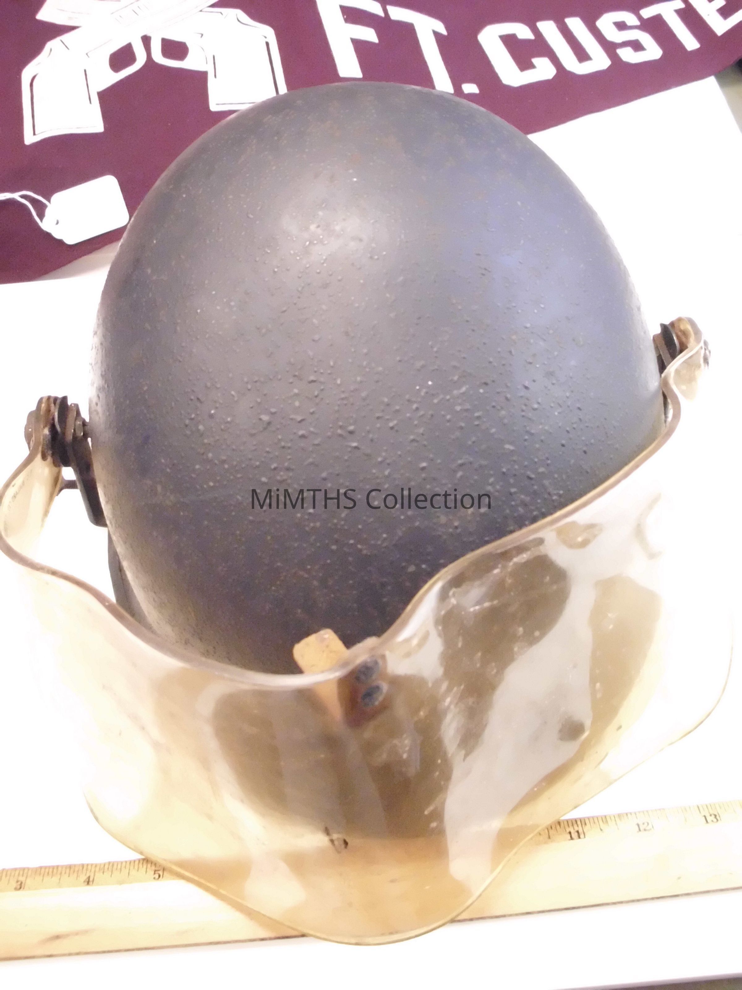 M1 helmet, WWII with cork finish, painted blue, later fiber liner Had Riot Shield, but it disintegrated as these often do.