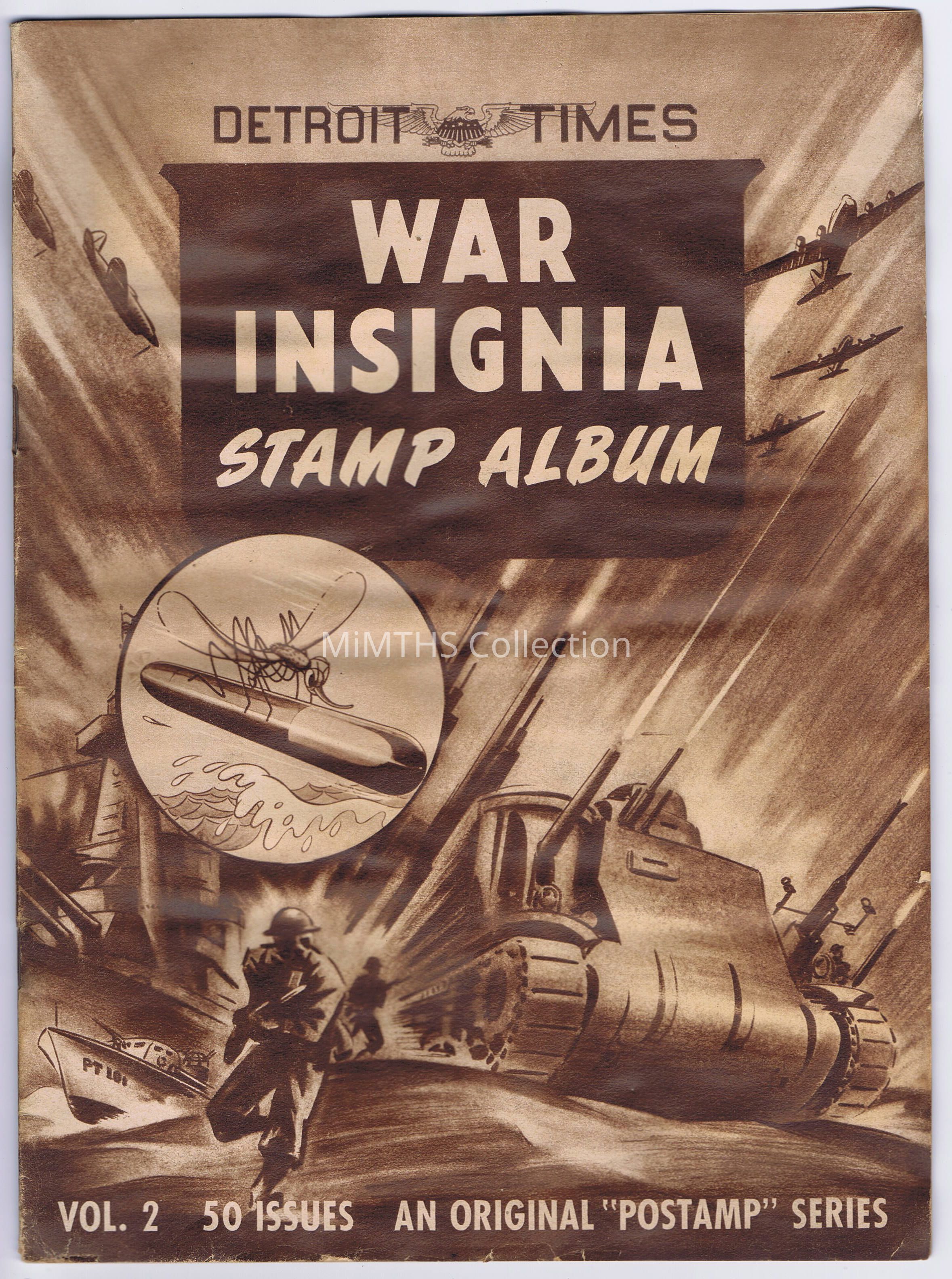 Volume 2 of the Detroit Times War Insignia Stamp Album. 3 albums were produced. Mostly complete, some stamps bave come loose from pages.Cataloged By