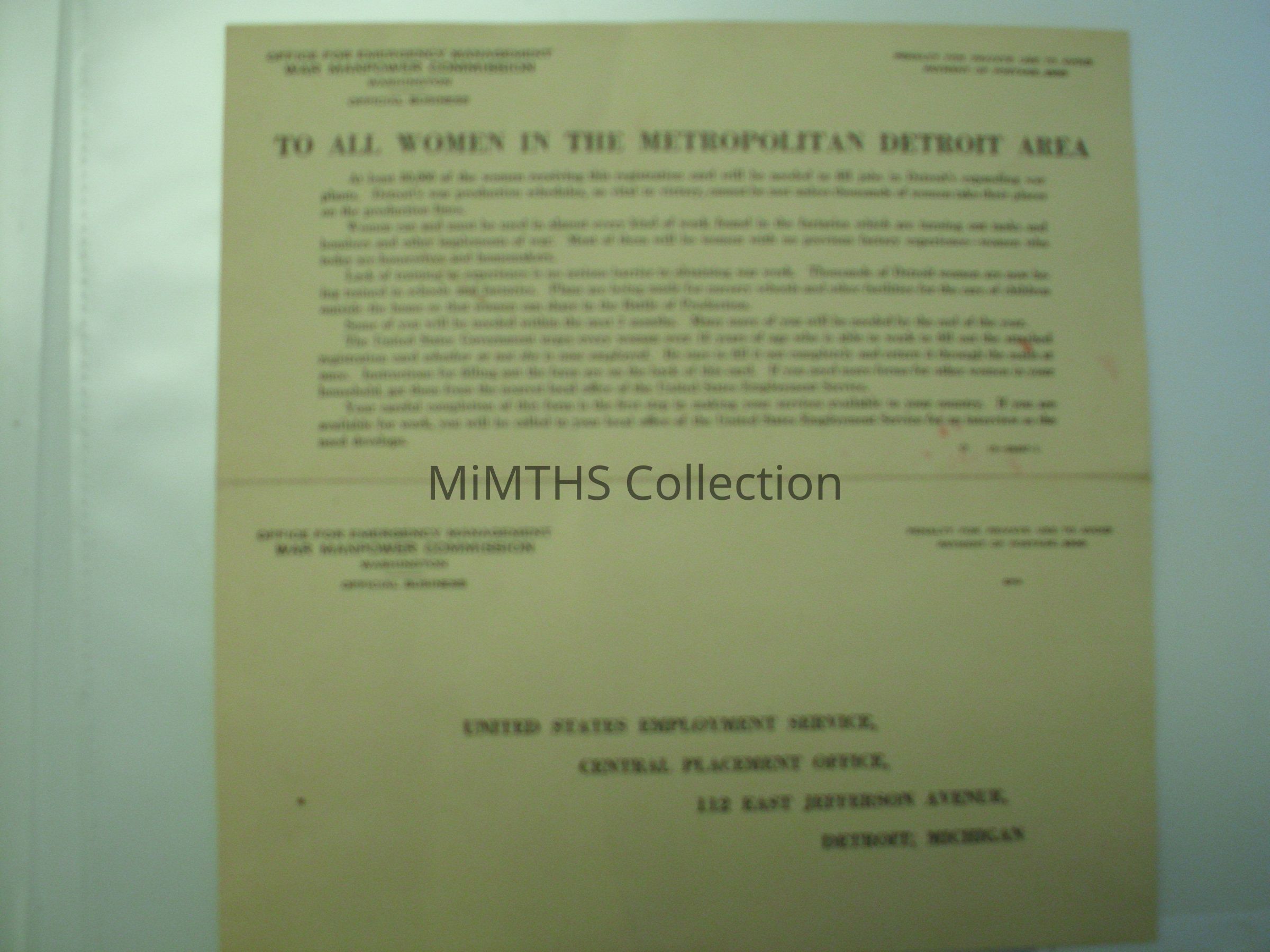 8x8 folded card from the War Manpower commission for the registration of women war workers in DetroitCataloged By