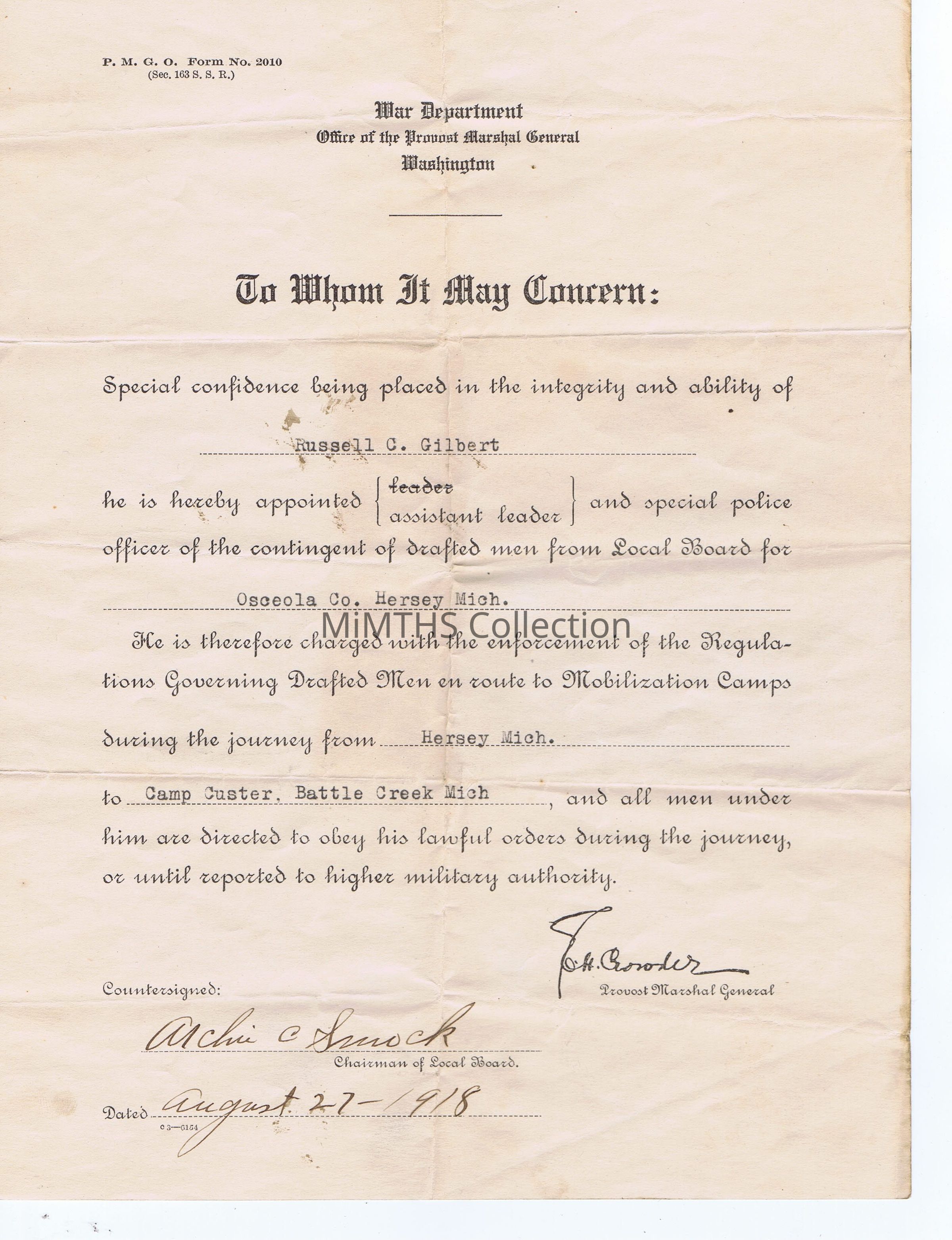 This letters notifies the recipient of the appointment of Russel C. Gilbert as leader and special police officer of the contingent of drafted men from Local Board for Osceola Co. Hersey Michigan.Cataloged By