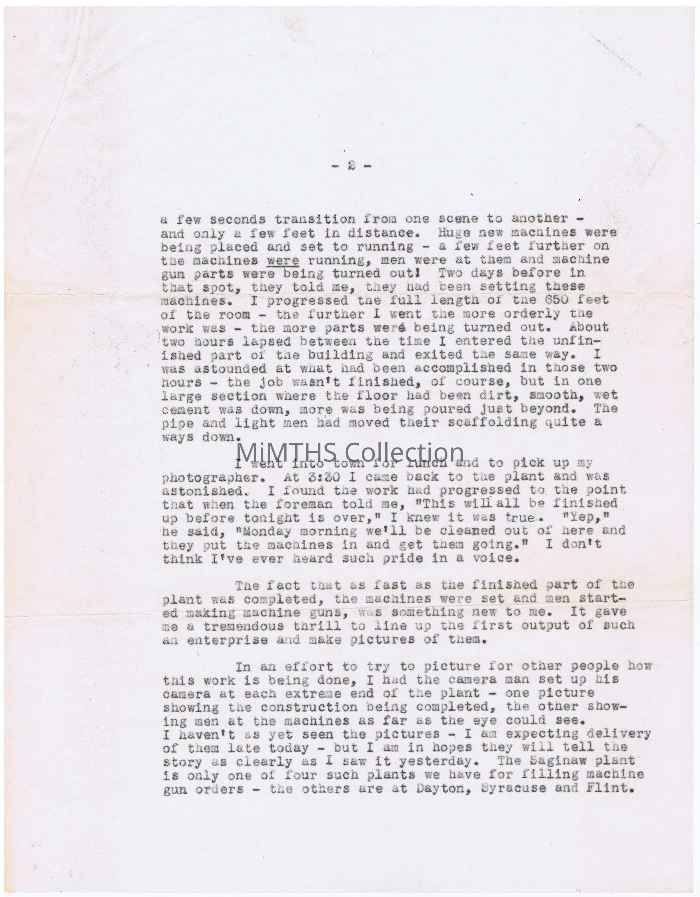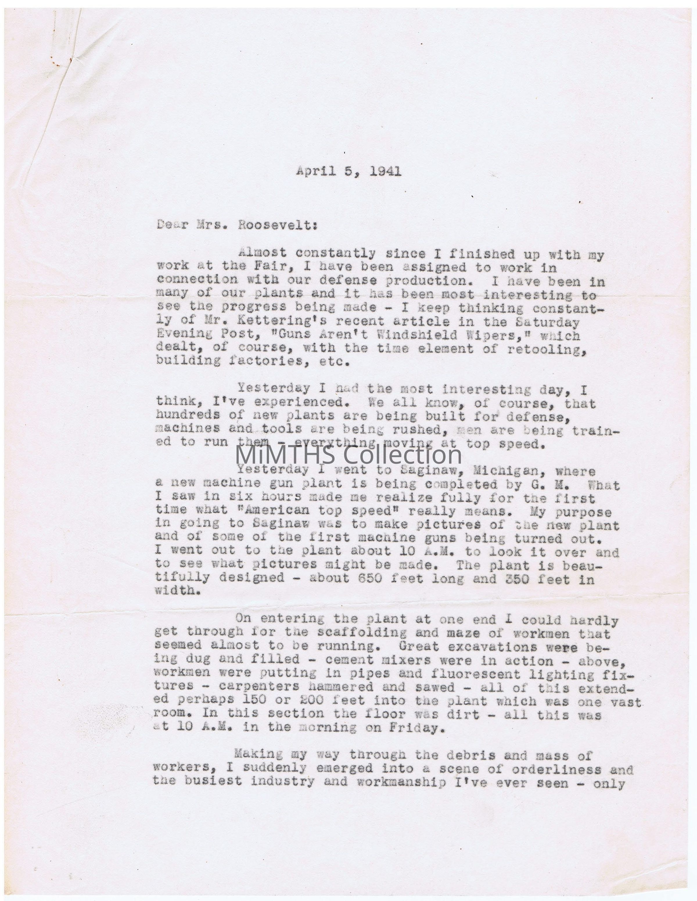 3 page letter on vellum from Frank Harting to Elenor Roosevelt describing his visit to the GM Saginaw Gun Plant, under construction.Cataloged By
