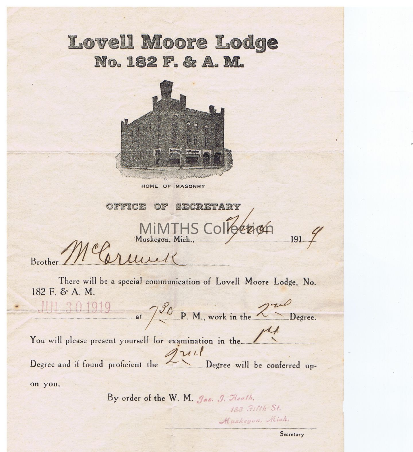 Lovell Moore Lodge letter to Elwin McCormick inviting him to an exam tro be decreed a 2nd degree mason.Cataloged By