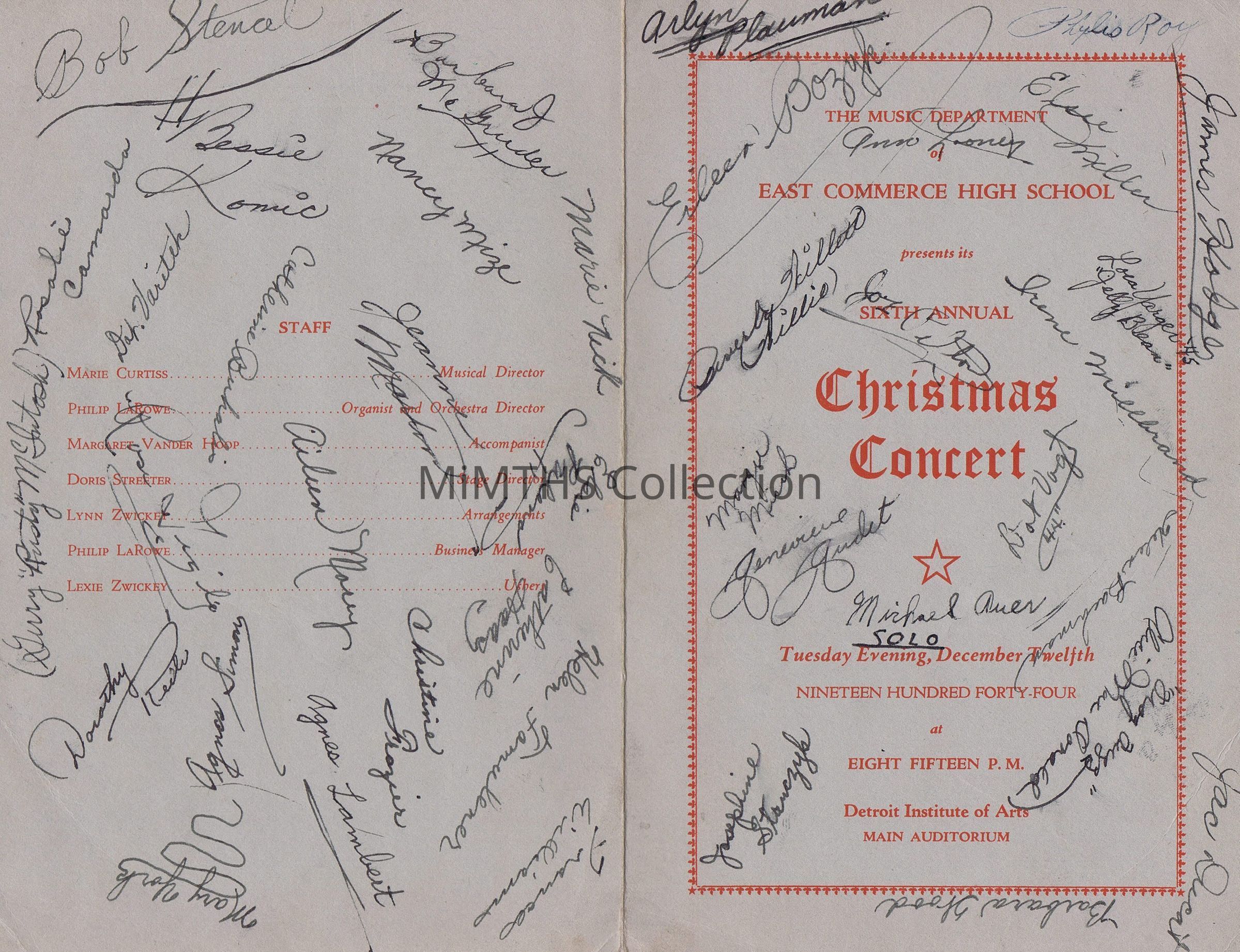 Event program for the 1944 East Commerce High School Christmas Concert. Held 12/12/1944 at the Detroit Institute of Arts Auditorium. Signed by the students.Cataloged By