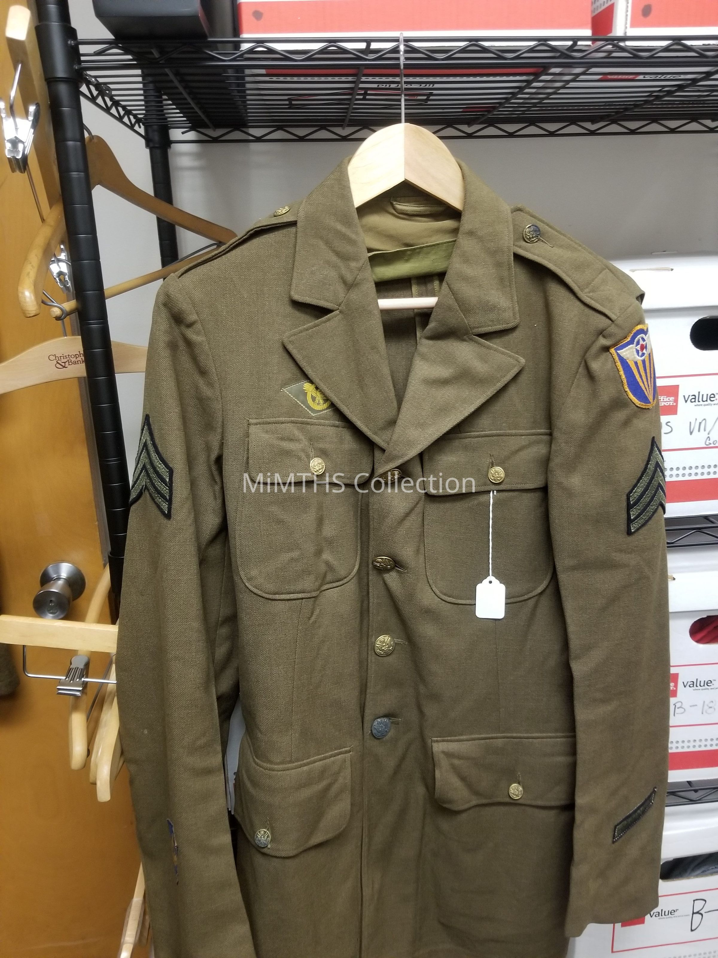 enlisted mans M1939 four pocket service coat with Sgt stripes, 4th AAF patch, three year Service Stripe, Engineering Specialist patch and ruptured Duck Worn By Sgt Glen Spurlock, East Detroit native.Acquisition