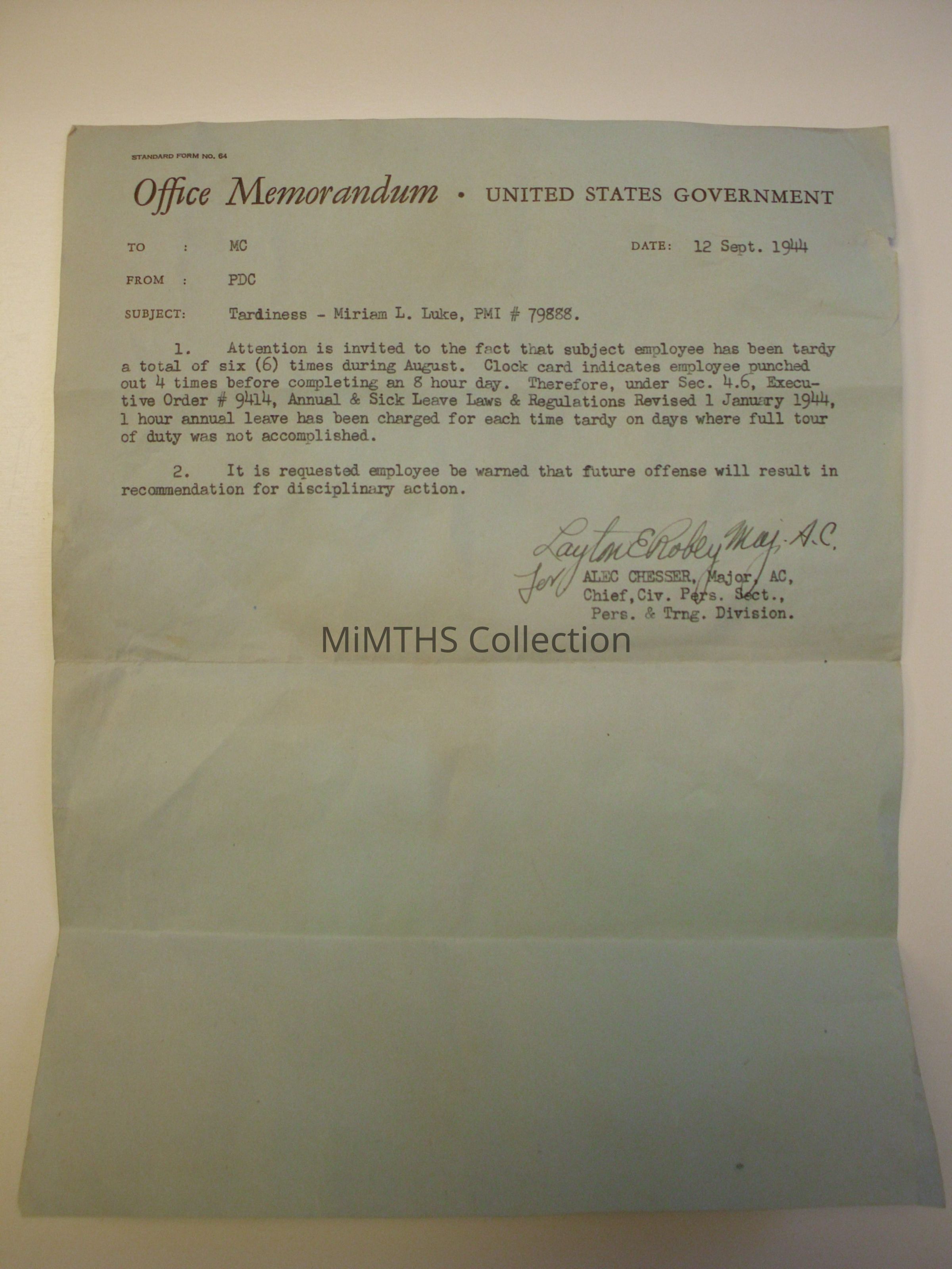8.5x11 blue paper letter on US Government letterhead informing Miriam Luke that continued tardiness will result in disciplinary measuresCataloged By