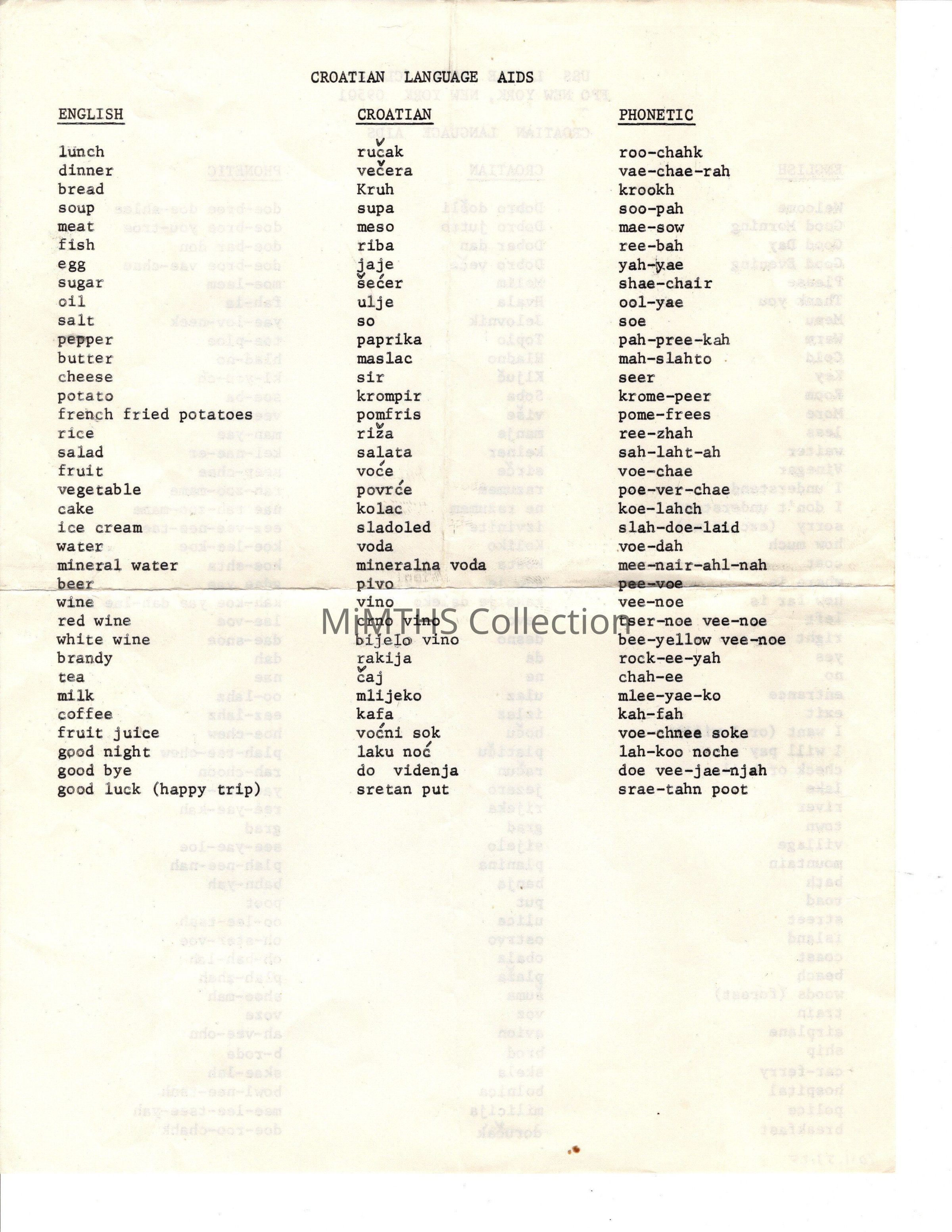 8x11 sheet. double sided printed on the USS Little Rock, English / Croatian language aideCataloged By
