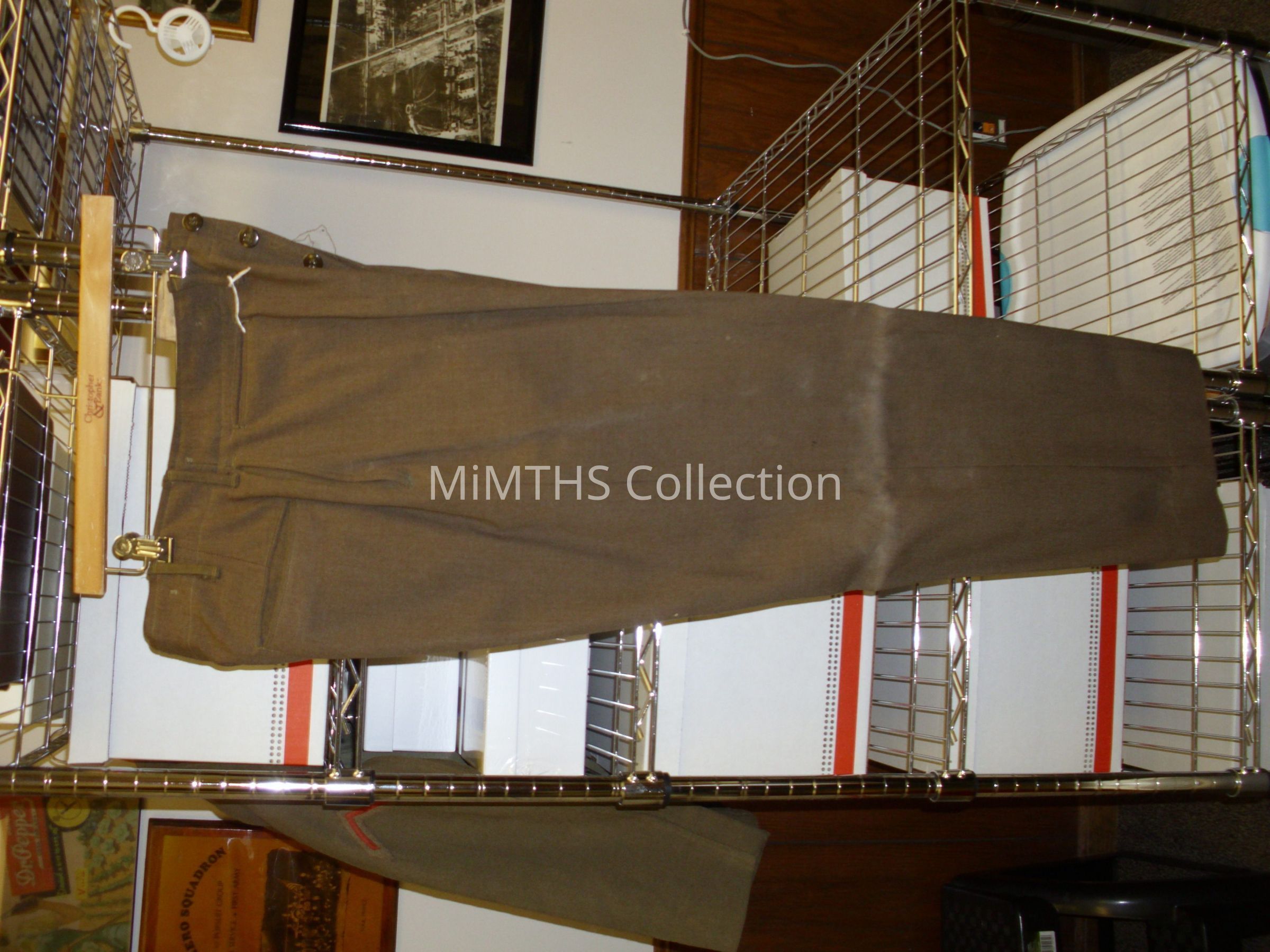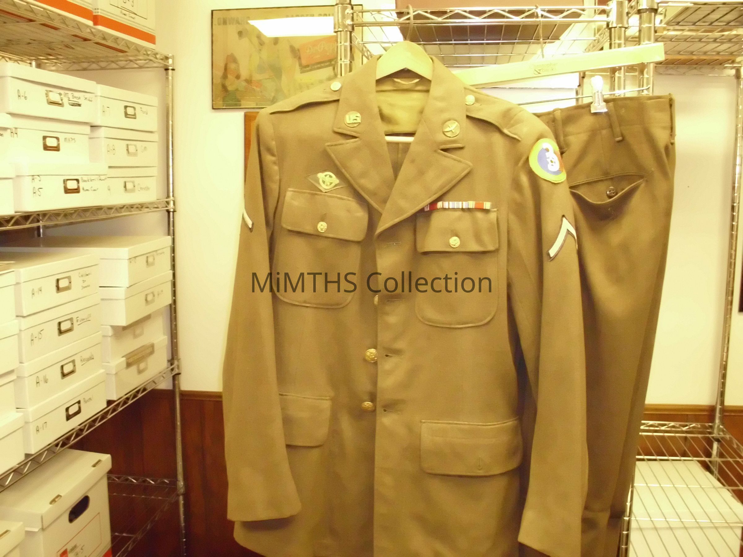 Service Uniform, Olive Colored, Four Pockets with four patches. 3 merit symbols, and two U.S. insignia on shoulders. The item was worn and owned by PFC Earl M. Starr. U.S.A.F. 1943-46.