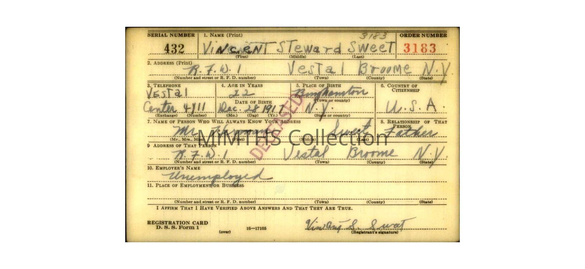 Vincent Steward Sweet was born on December 28, 1917, in Binghamton, Broome County, New York. He attended school in Vestal Center and Endicott.