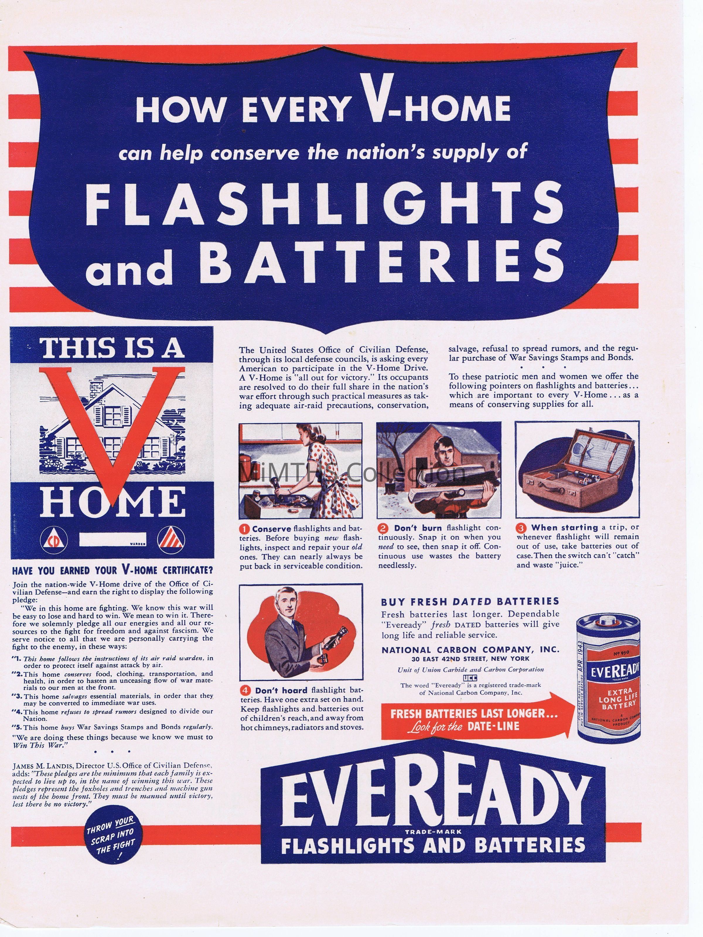 Magazine ad for Eveready batteries. WWII era. Not Michigan specific, but has a good explanation of what the "This is a V Home" window card was for.Cataloged By