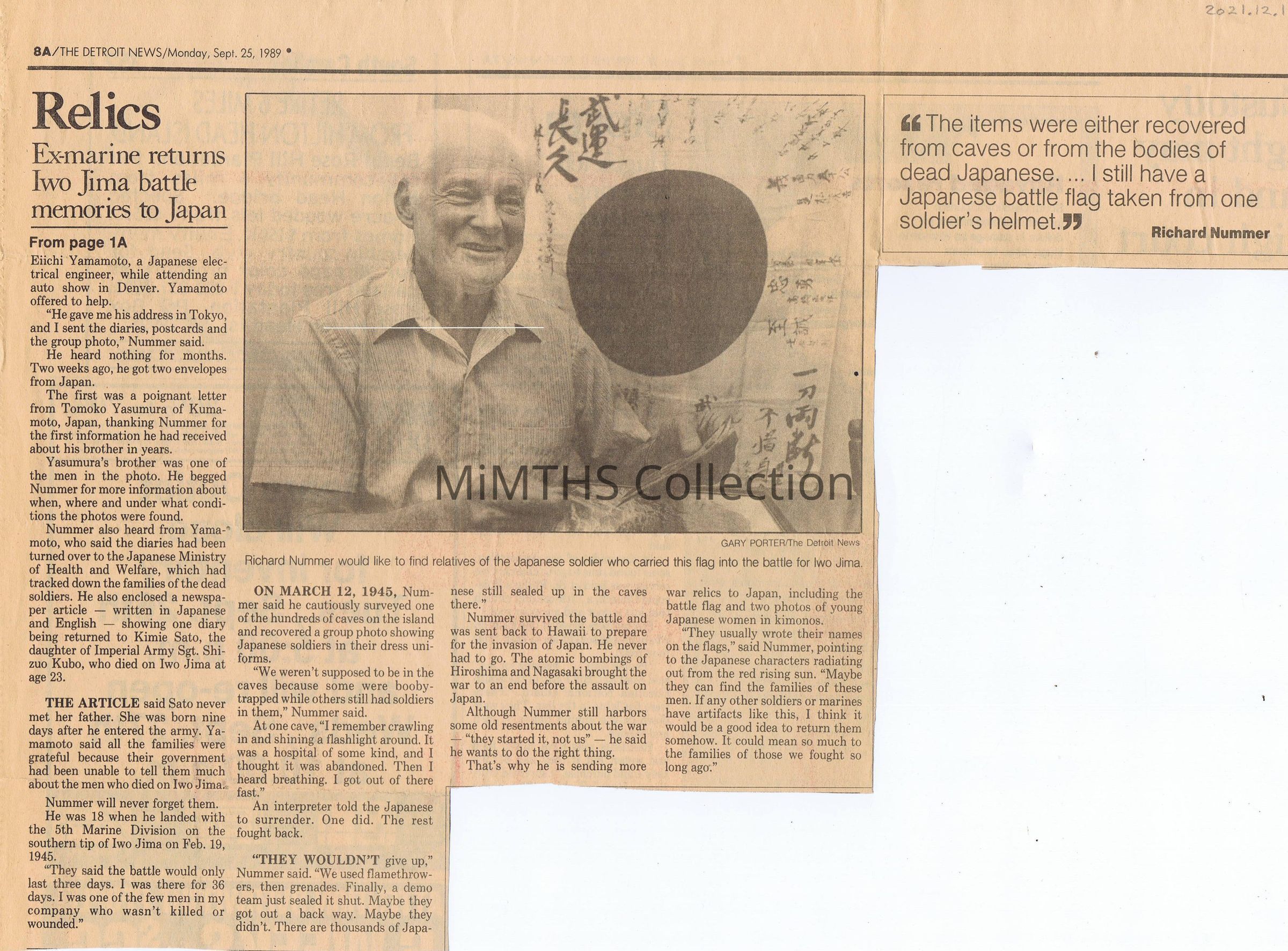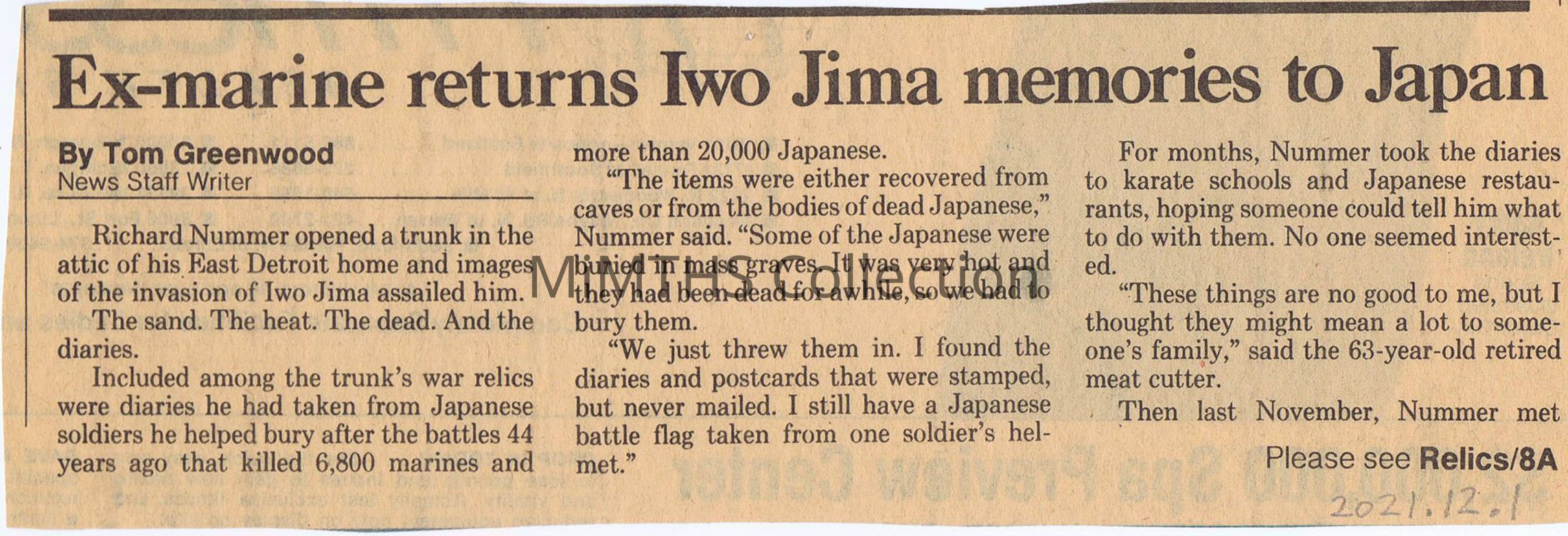 Article tells story of Richard Nummer, who fought in Iwo Jima, and how he returned items to the families of deceased Japanese soldiers 44 years laterCataloged By