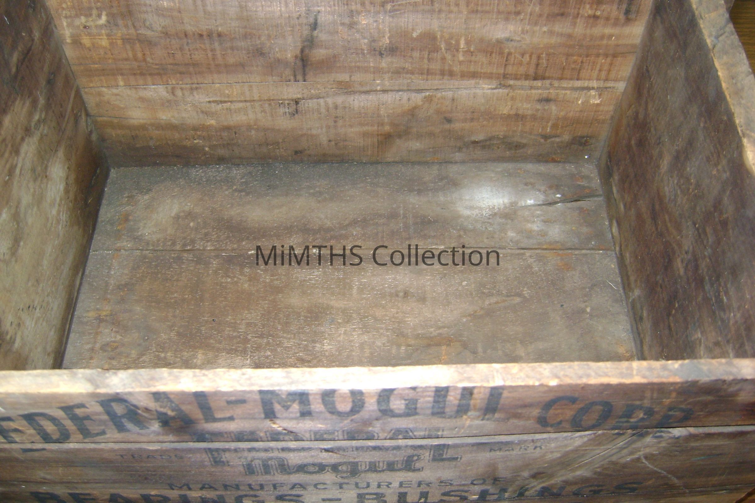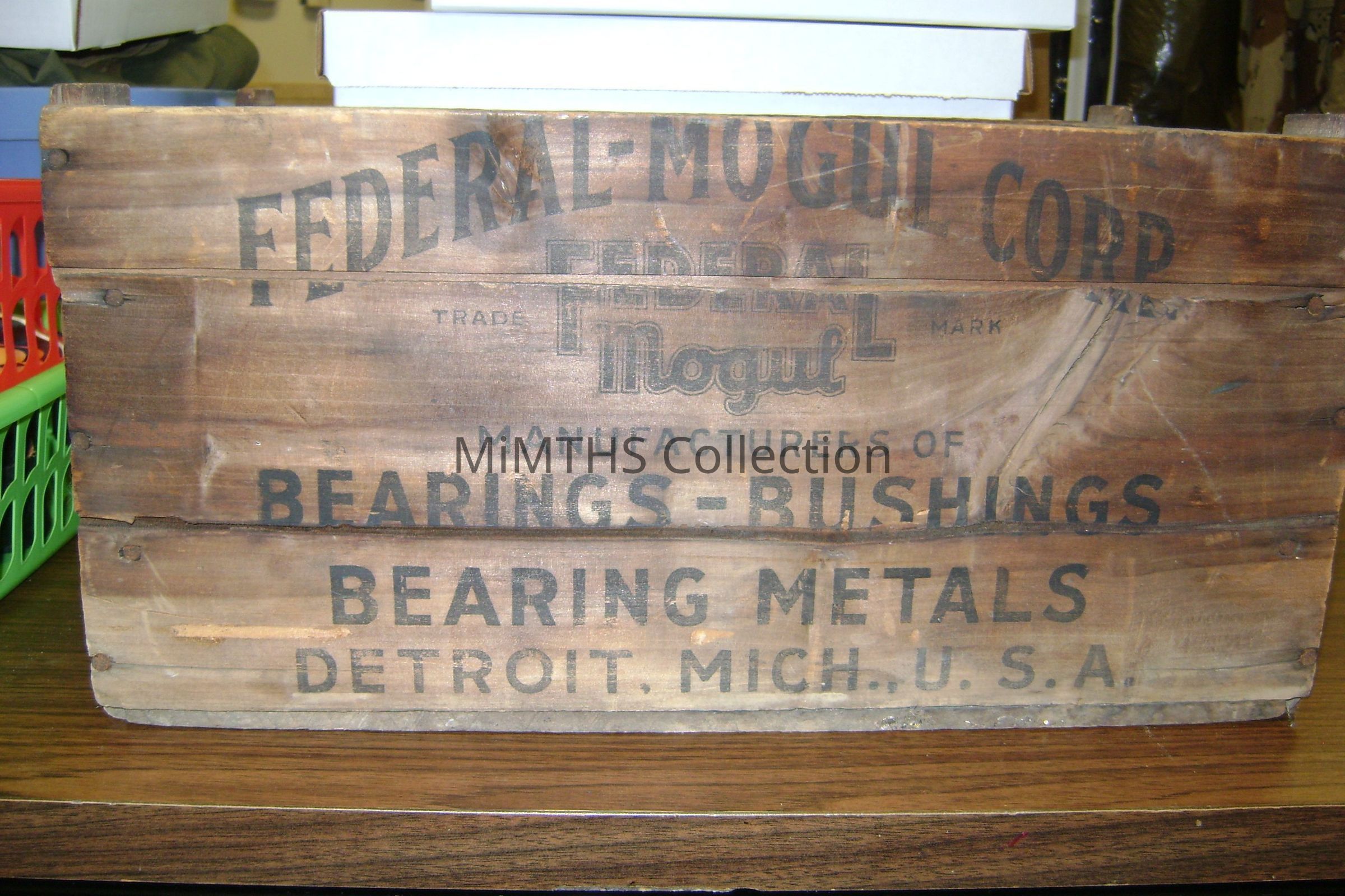 17"x9"x11" wooden crate from the Detroit Federal Mogul bearing and bushing plant. Donated by Joe Coppens, the crate came from his grandmother who worked there. Exact age unknown.Cataloged By