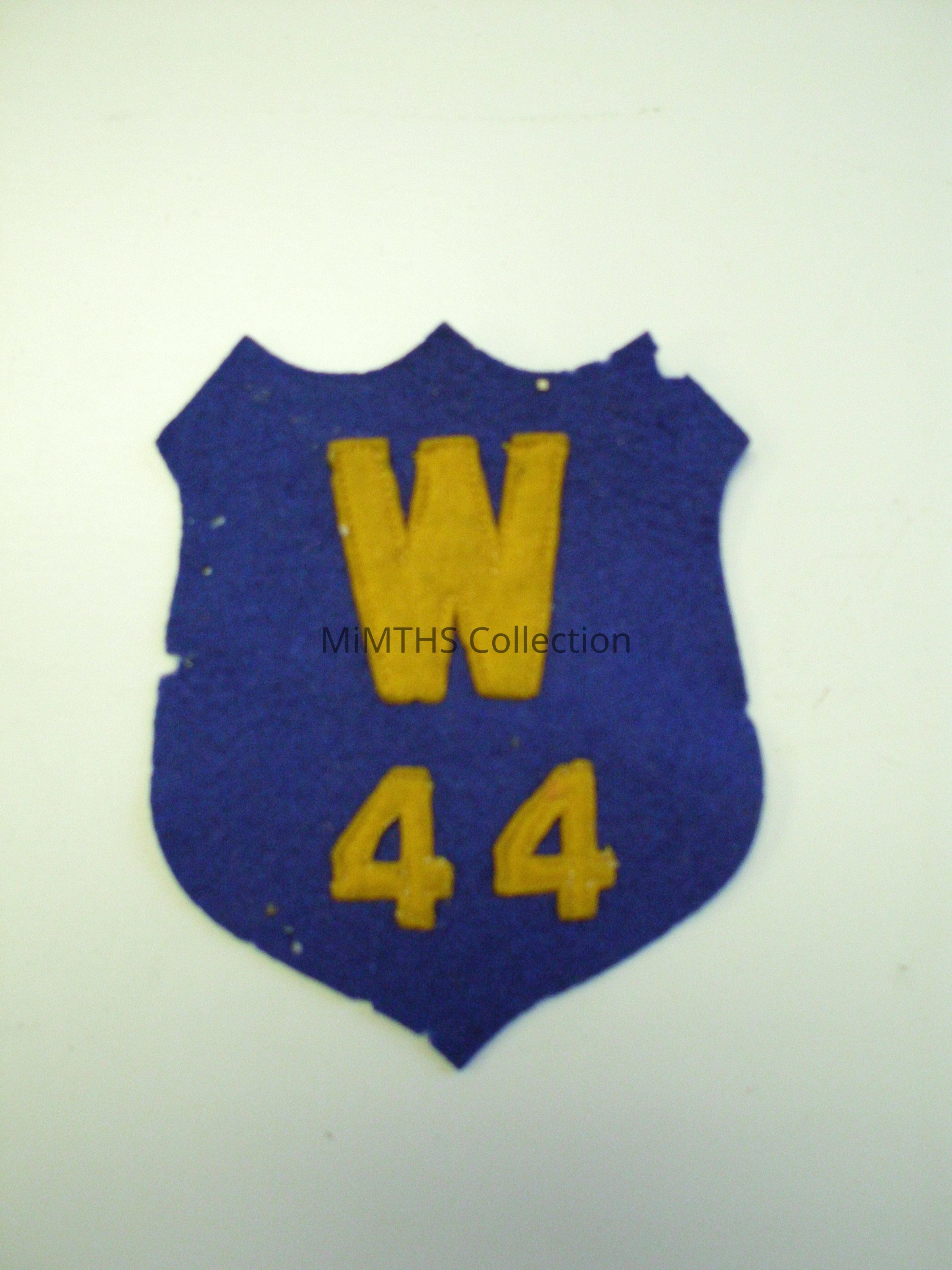 Blue felt patch with a Yellow W and 44 sewn on. Origin unknown, came in the Evanoff foot locker. His family lived in Ypsilanti and his mother worked at Willow Run, he had a younger brother who could have graduated from an Ypsilanti / Willow Run School in 1944. School patch??Cataloged By