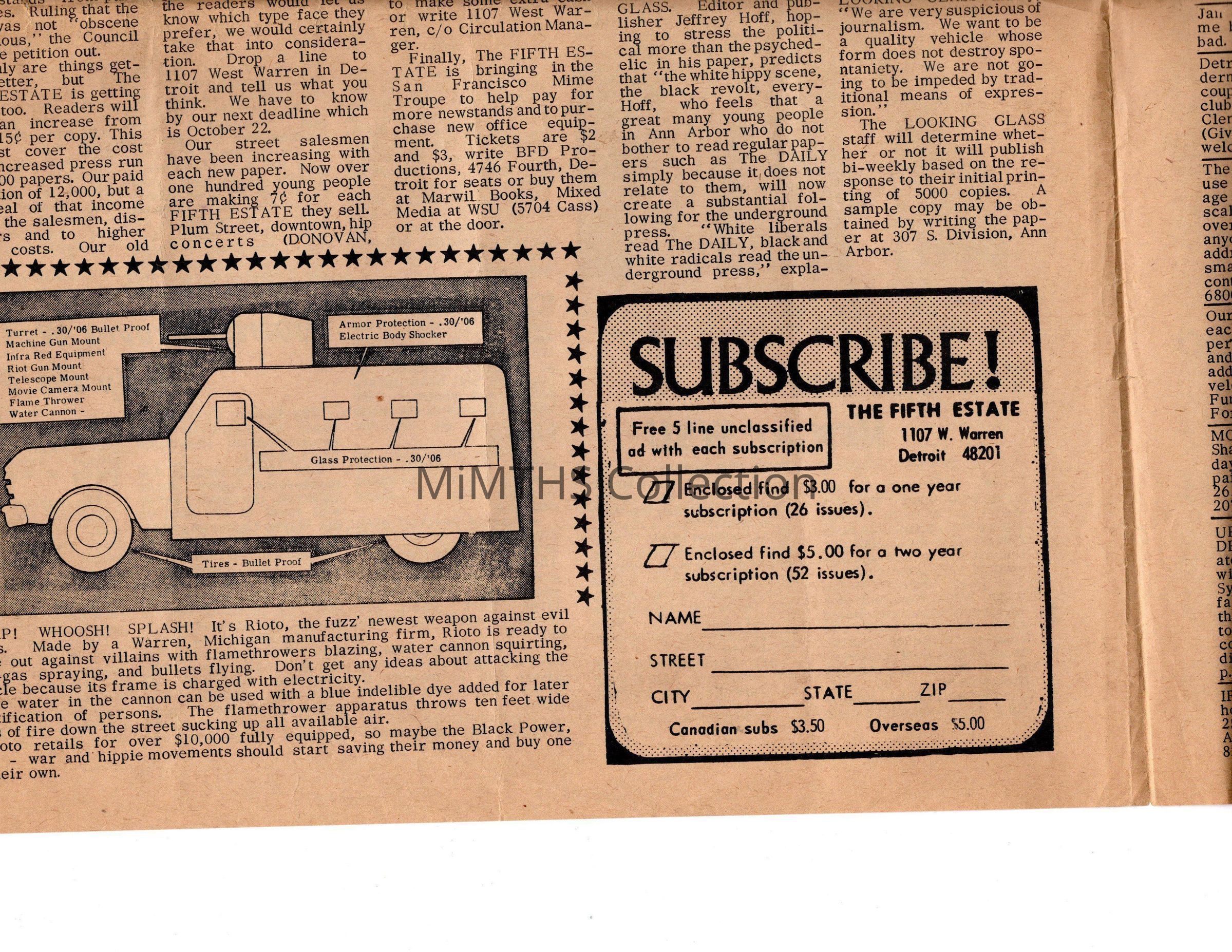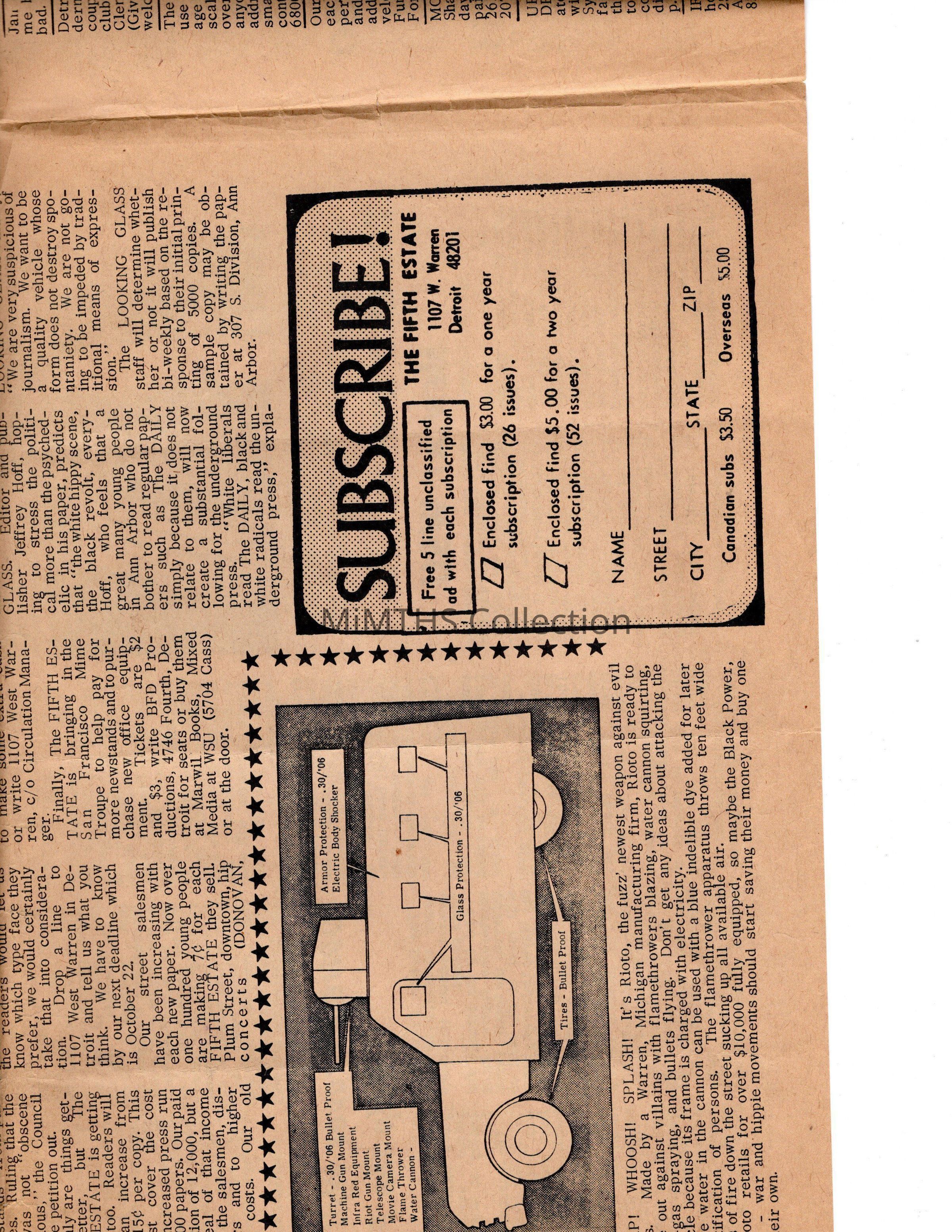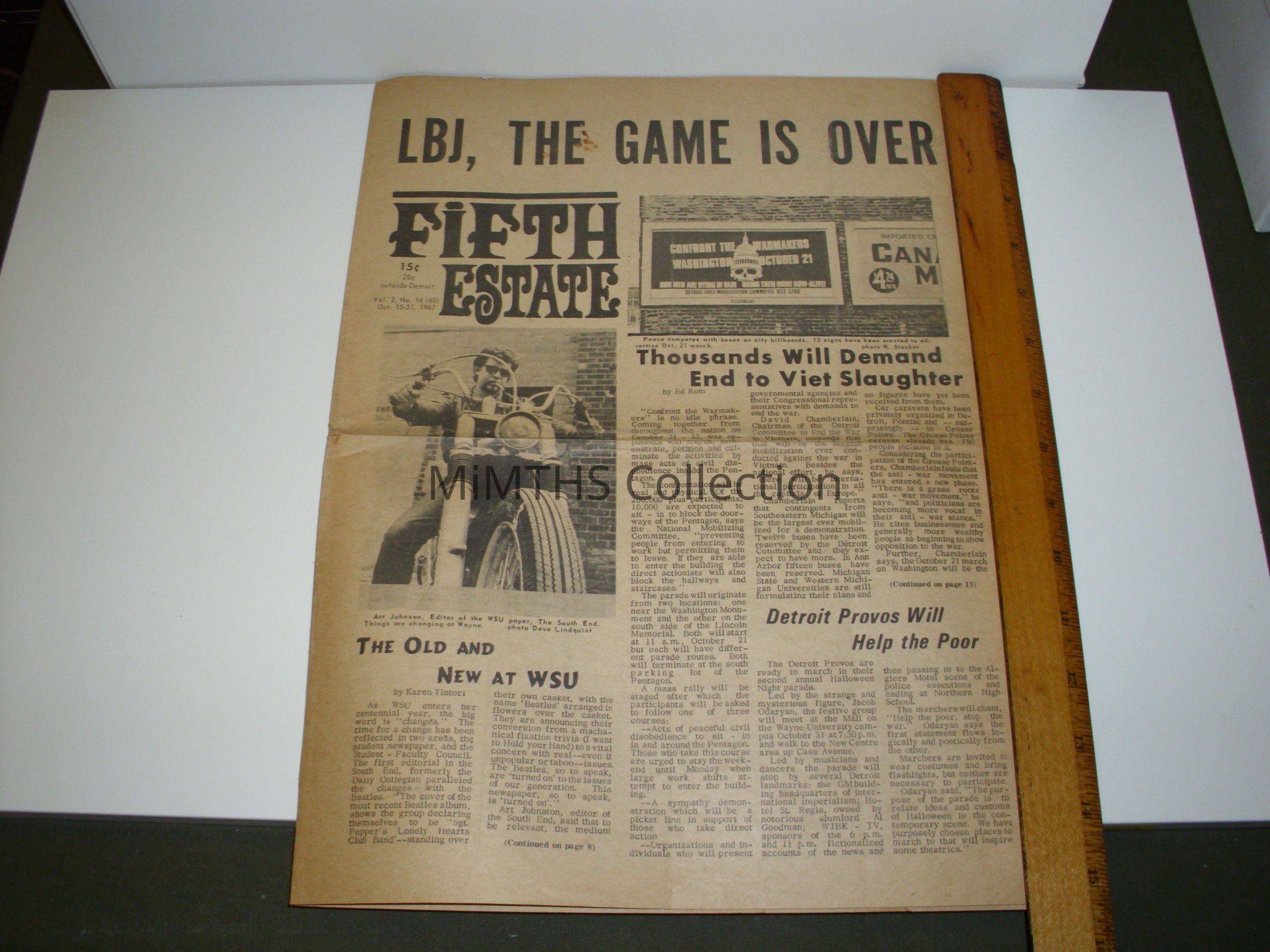 Fifth Estate newspaper Volume 2, Number 14. Oct. 15-31, 1967 issue. Front page section that contains page 1-2 and page 15-16. Headline is LBJ, the game is over. Has article on Michigan made police riot control vehicle. The Rioto was manufactured by Bauer Ordnance in Detroit.Cataloged By