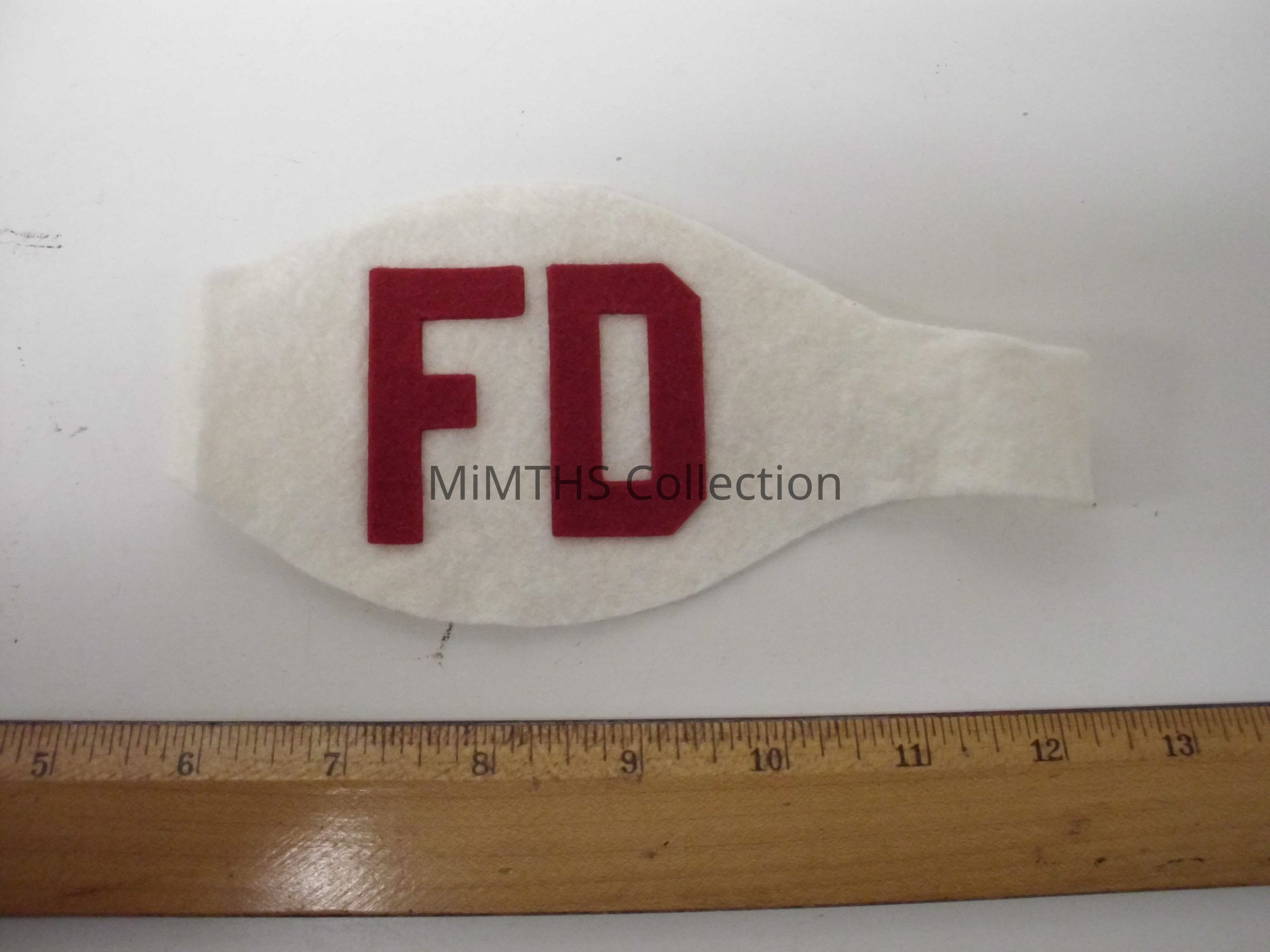 Whte felt arm band with red FD and elastic band.