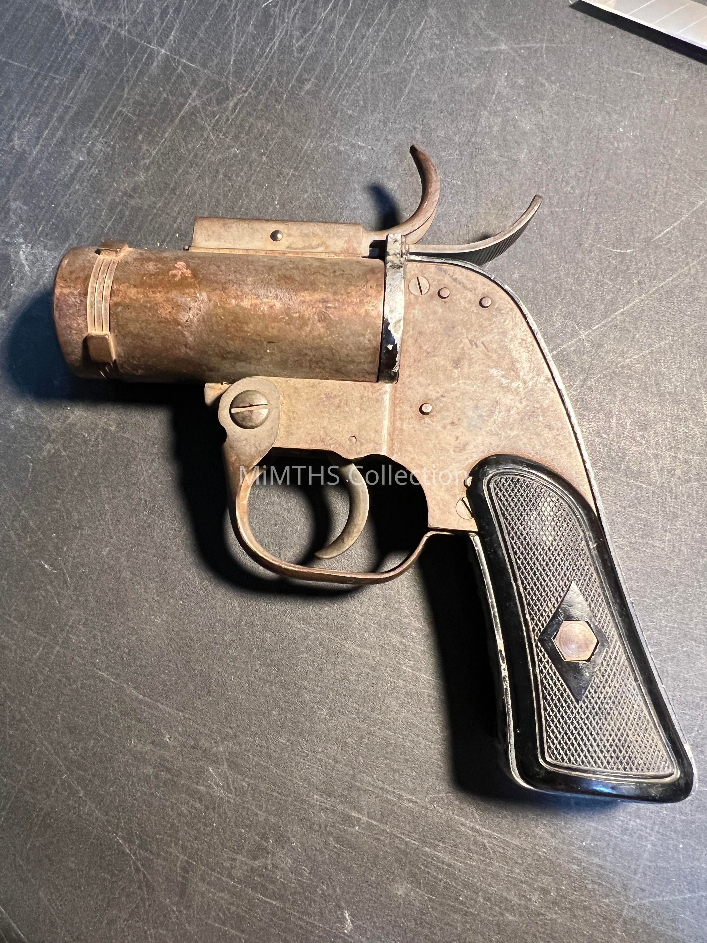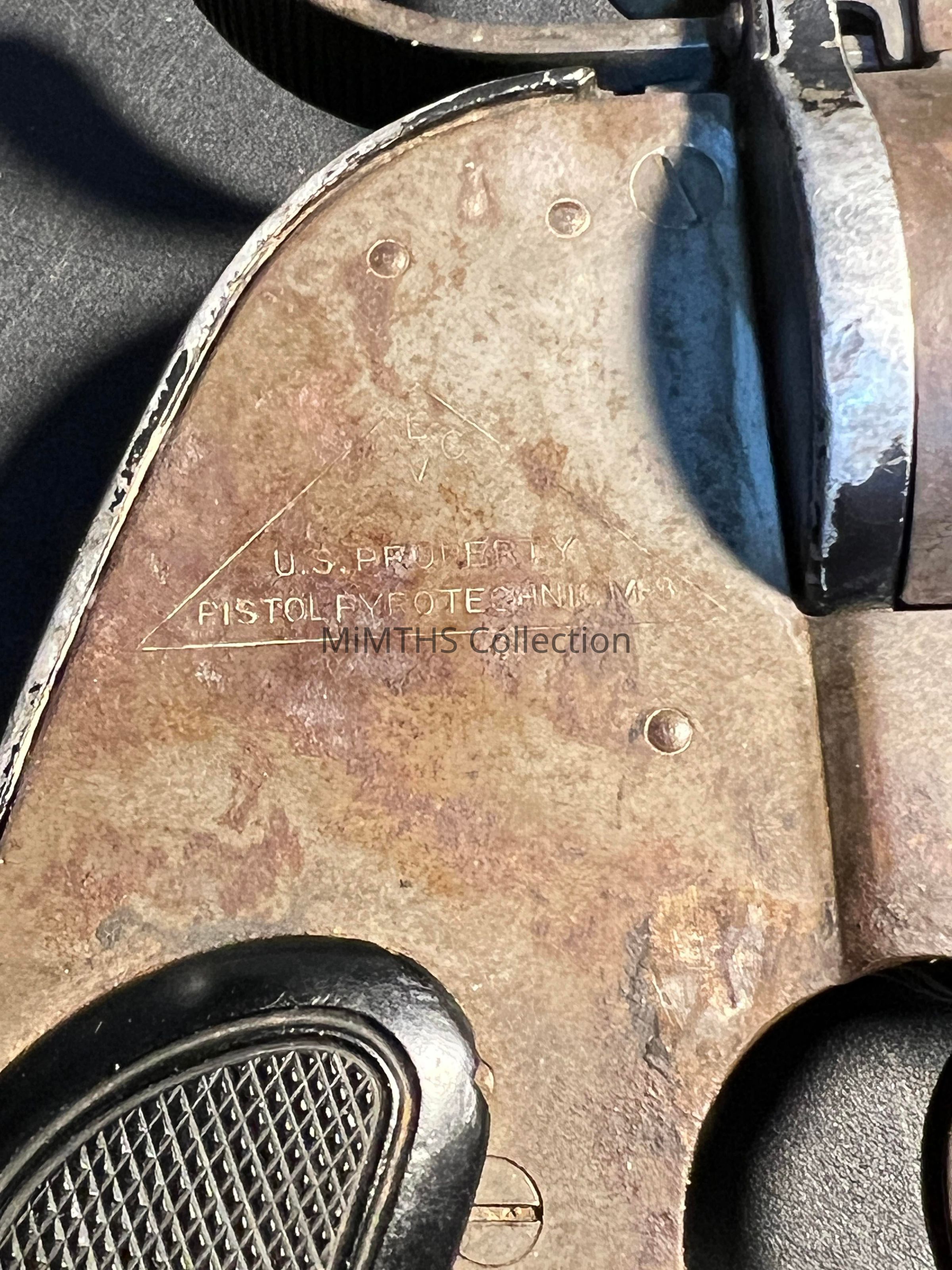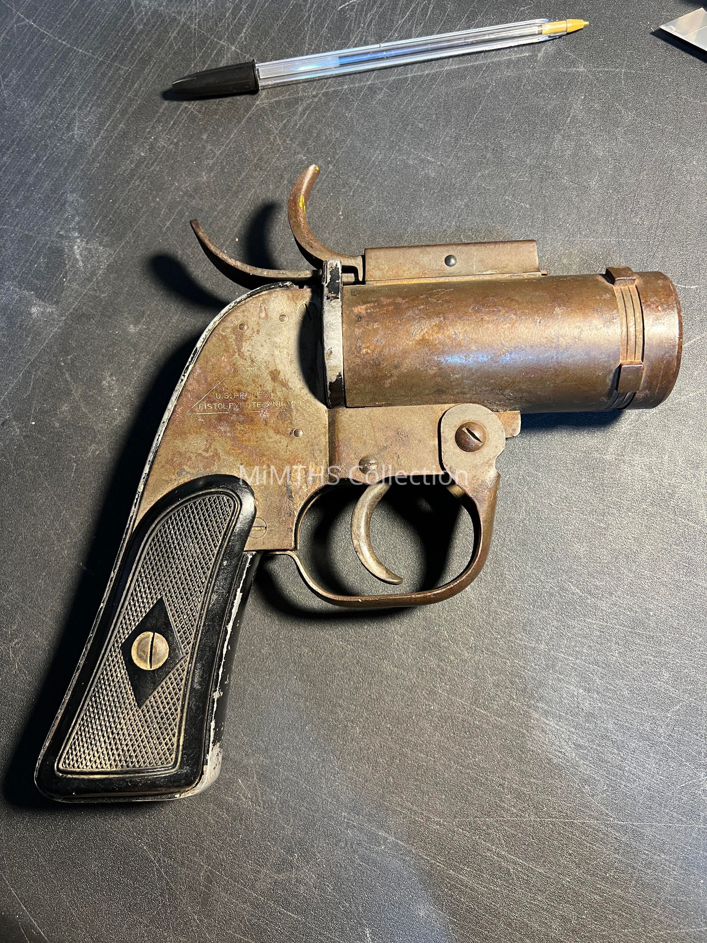 This is a flare pistol, mainly used during and after WW2 in aircraft. Although intended to be mounted in the M1 aircraft mount, this flare pistol can be used as a conventional flare pistol. The barrel hinges down to allow removing a spent cartridge or loading a cartridge