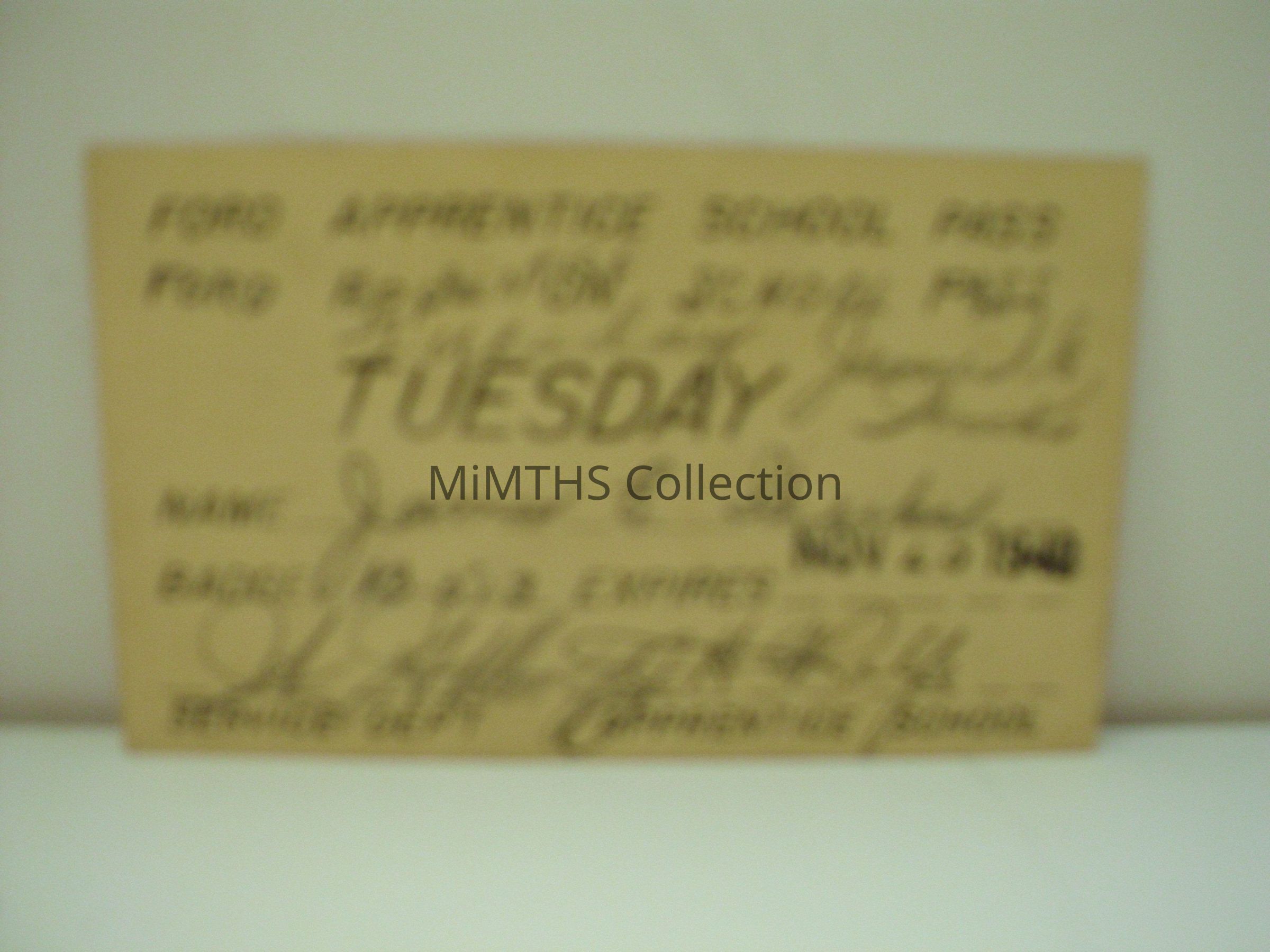Tuesday school pass for the Ford Apprentice School November 23 1940Cataloged By
