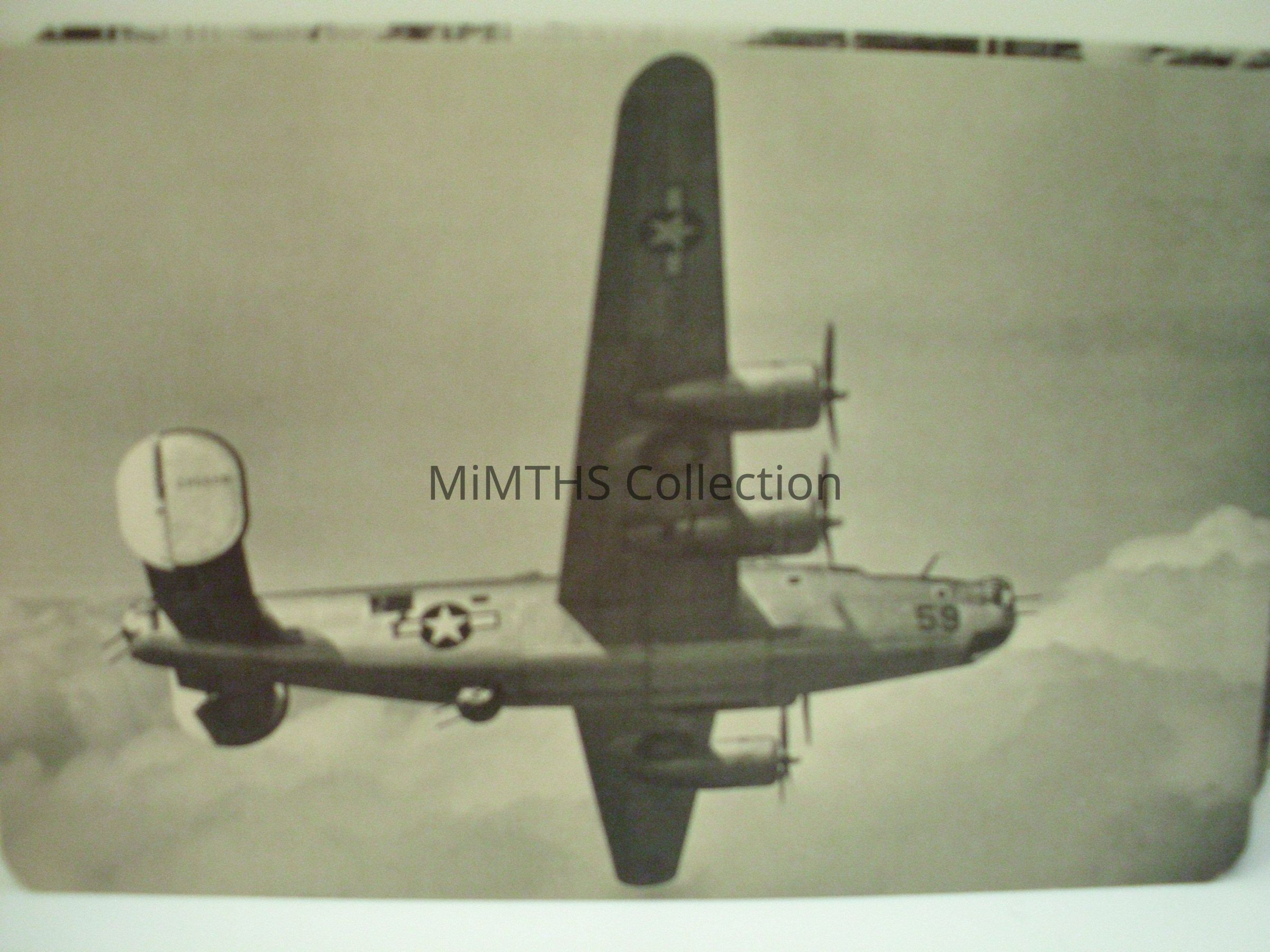 Postcard with B24 in flight from underside. Part of the series of Ford war production postcards from WWII. Sources indicate there were 27 cards in the series. "Building Wings and Wheels for Victory"Cataloged By
