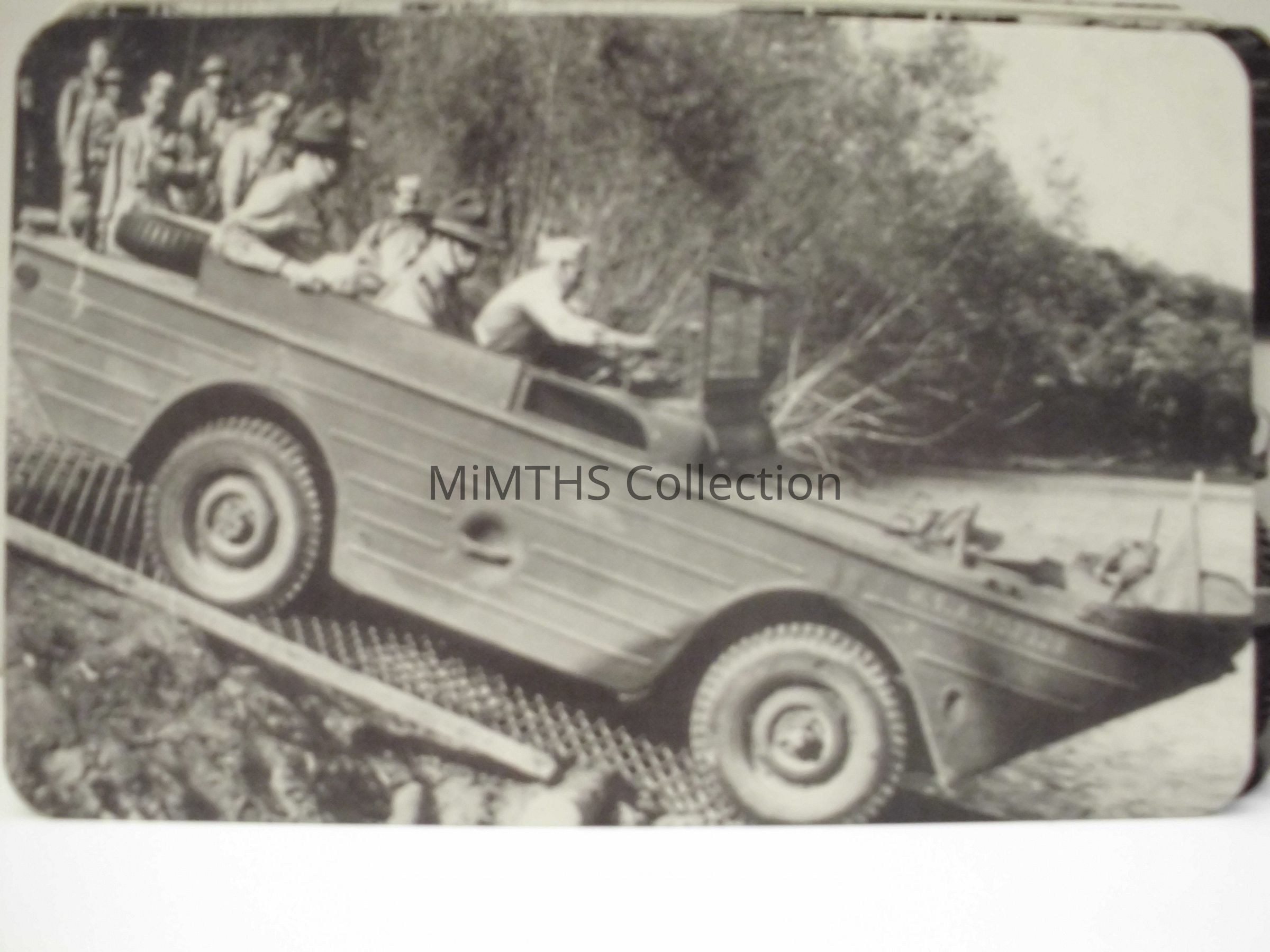 Picture postcard of a Ford GPA driving down a boat launch, probably taken at the Rouge Complex. Part of the series of Ford war production postcards from WWII. Sources indicate there were 27 cards in the series. "Building Wings and Wheels for Victory"Cataloged By