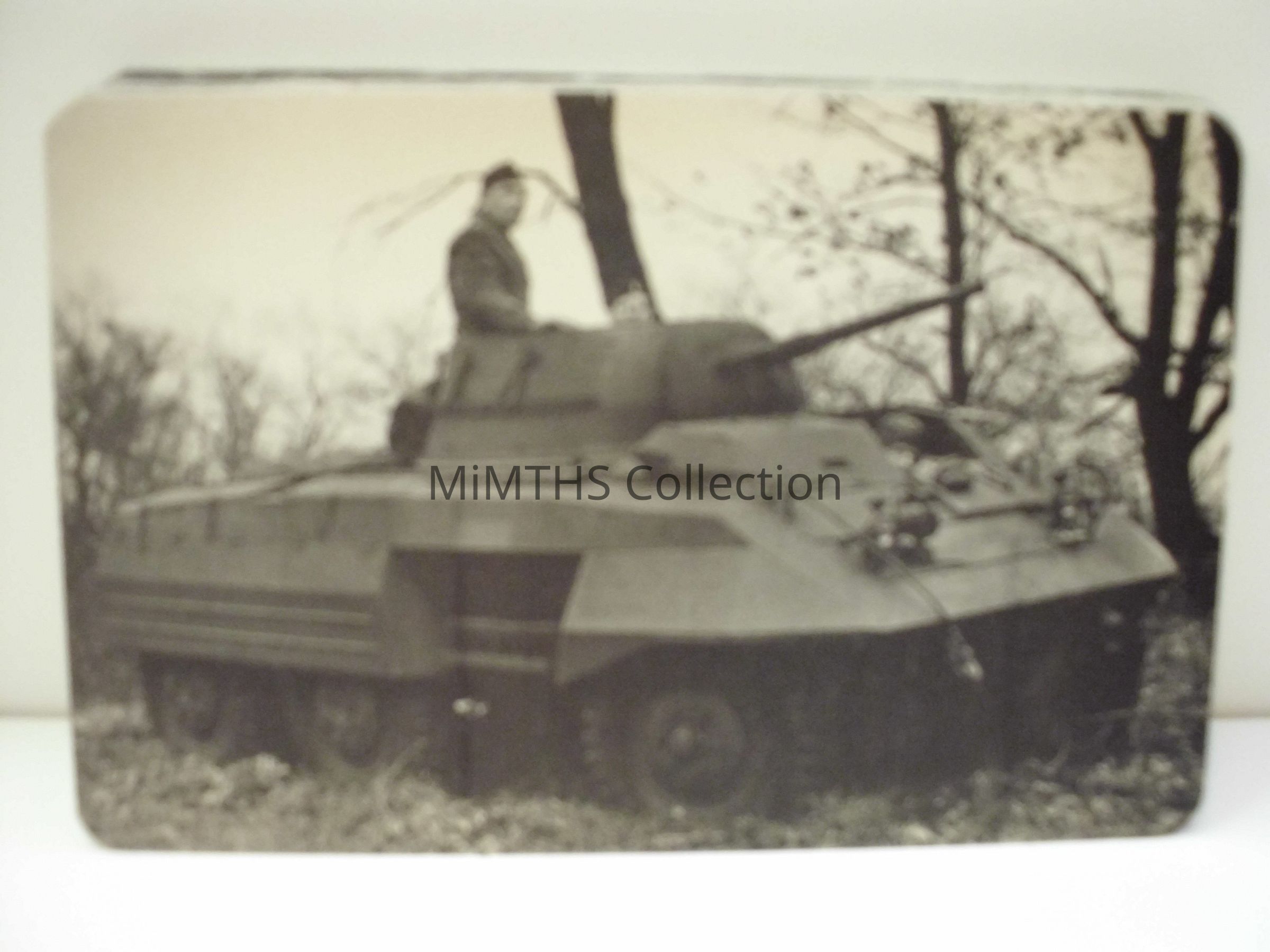 Picture postcard featuring a front 3/4 view of the M20 Armored Car made by Ford. Part of the series of Ford war production postcards from WWII. Sources indicate there were 27 cards in the series. "Building Wings and Wheels for Victory"Cataloged By