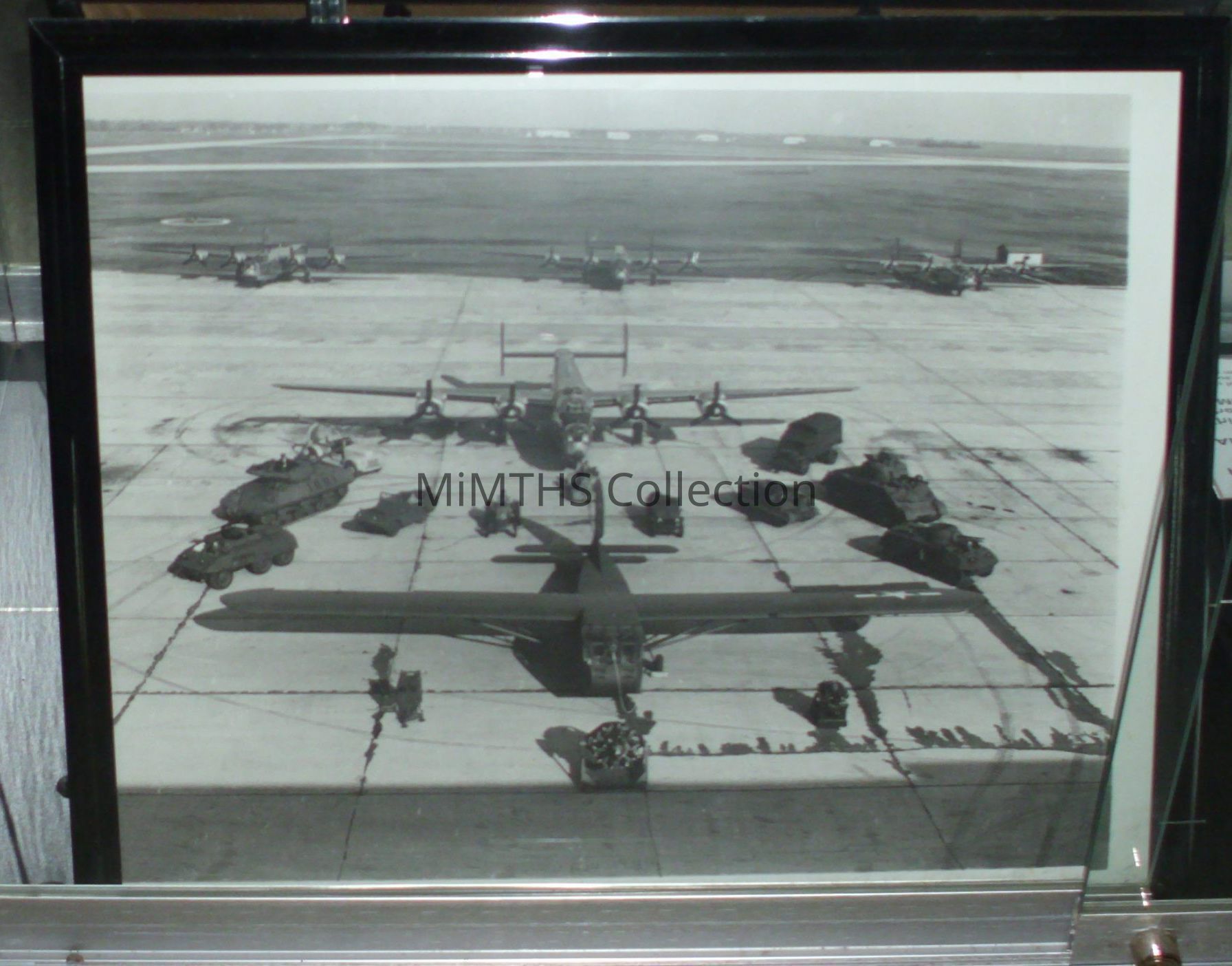 Large format print of the Ford built products display in front of Willow Run Hangar One, taken from the control tower. Well known Ford WWII PR image.Photograph Details
