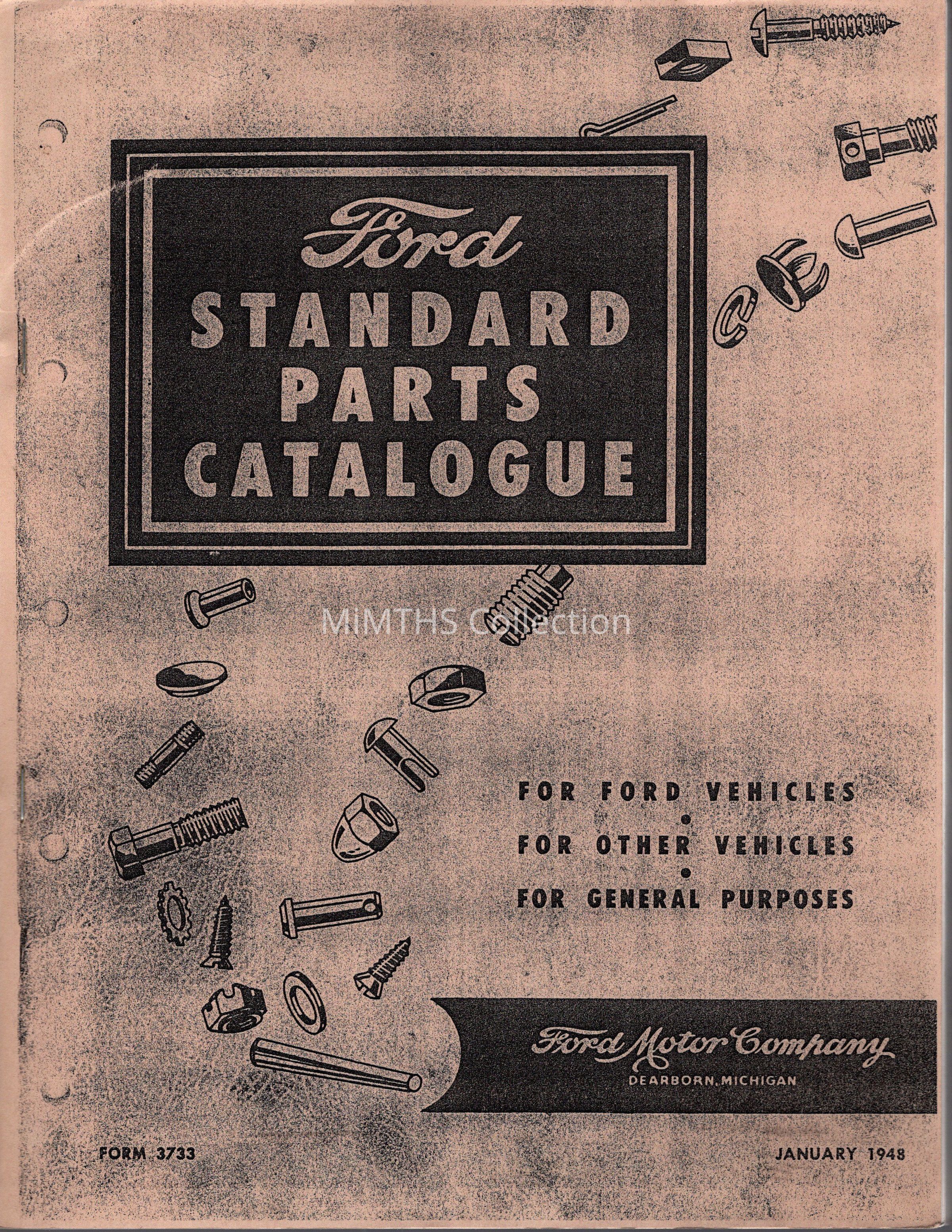 Ford Standard Parts Catalog. Covers all types of Ford vehicles (military & civilian). Illustrated directory of bolts, nuts, washers, fasteners. 1948 edition. 53 pages.Cataloged By