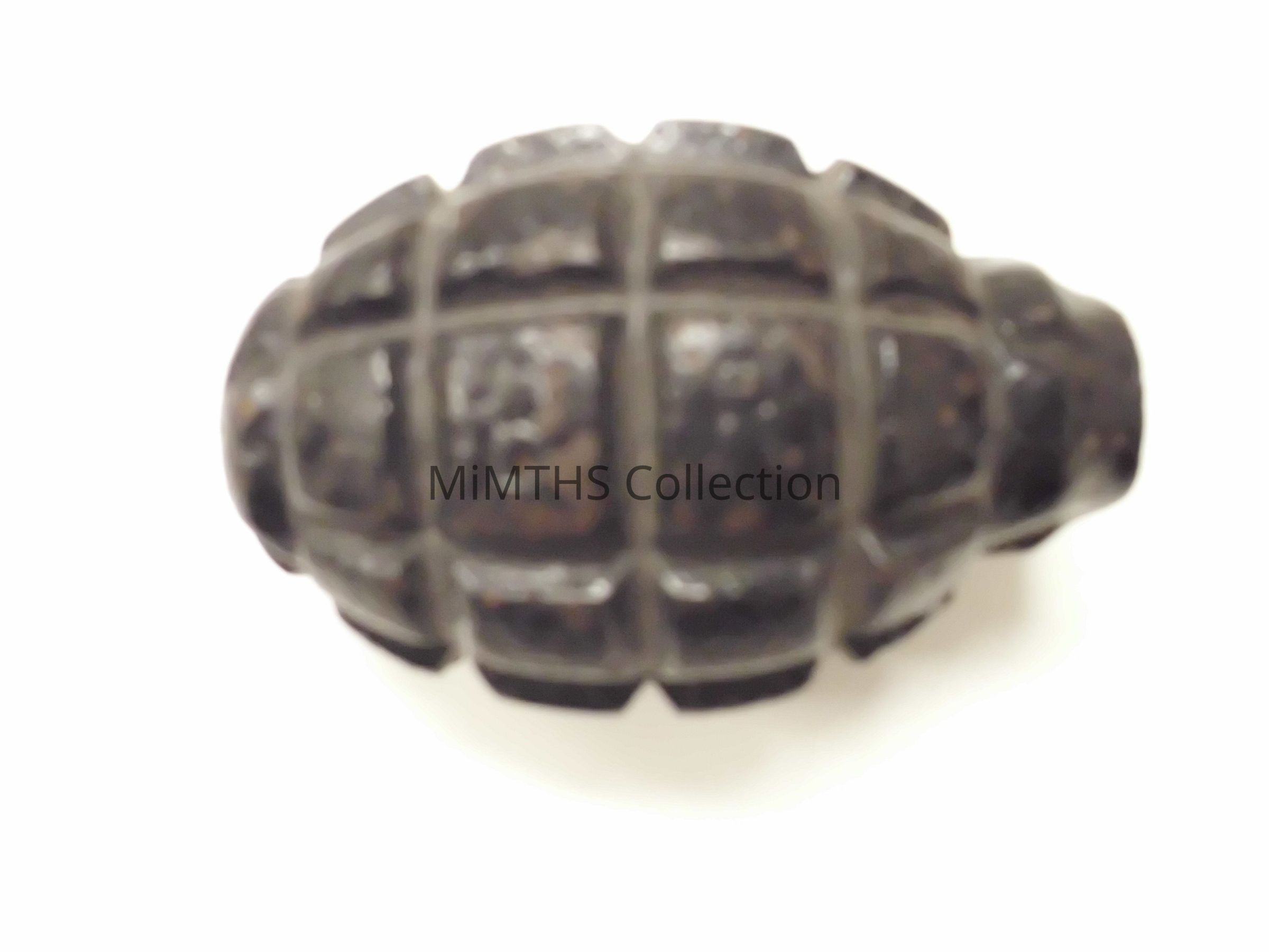 French model F1 hand grenade. Marked "BR" Probably an inter-war training grenade. Painted black. Sparks – Withington Co., Jackson made Hand Grenade castings like this during WWI.Cataloged By
